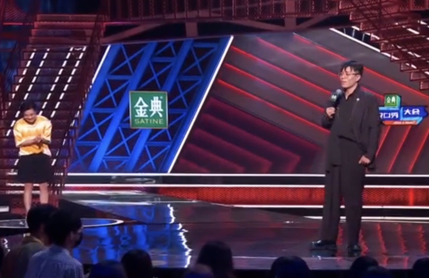 在等待区看对手演出,一边笑一边鼓掌。