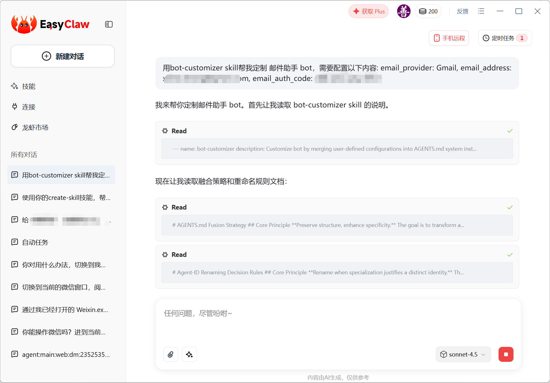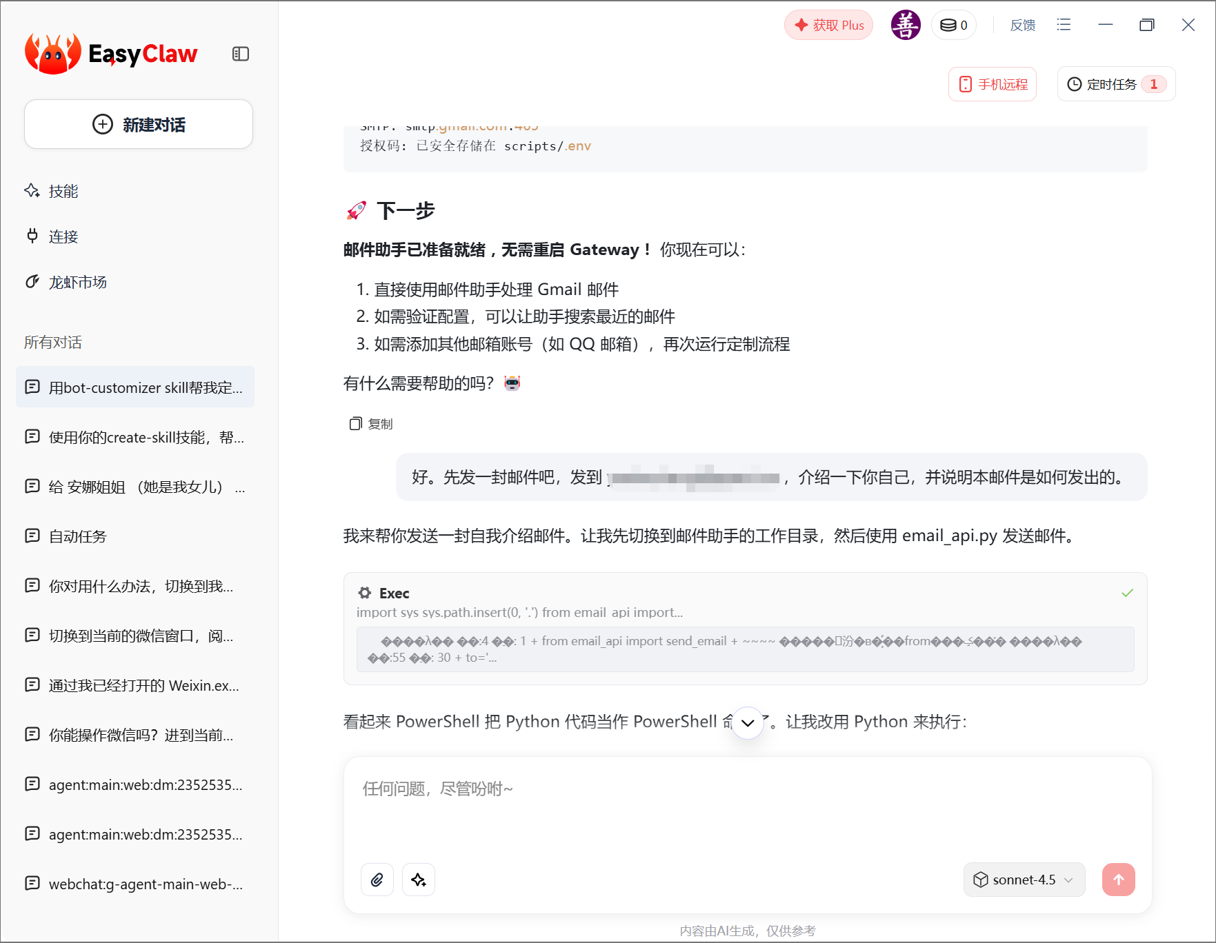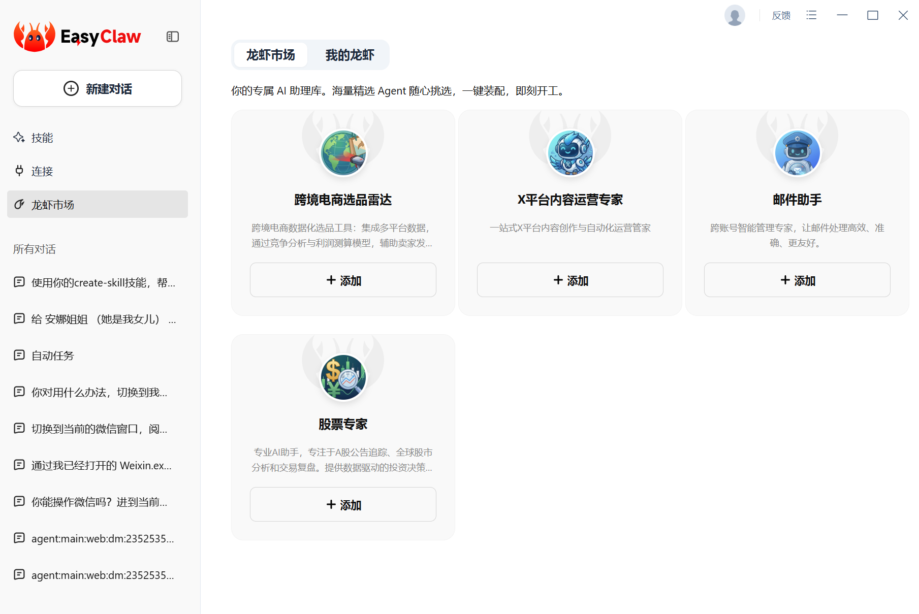 🦞EasyClaw 重磅升级 v1.3.1,上线「龙虾市场」。打个比方,skill市场是让小虾学会新技能,龙虾市场则是直接雇佣成品虾。记得傅盛总的龙虾团队吗?你可以直接挖过来用。目前上线4只:股票、跨境电商、X推特、邮箱。我先试了邮箱,配置顺利(消耗150积分),再让它发邮件,应该会成功吧,实际上【积分耗尽】😄