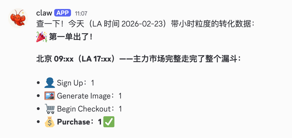 开工大吉,前天让龙虾帮我投的广告,今天开始出单了