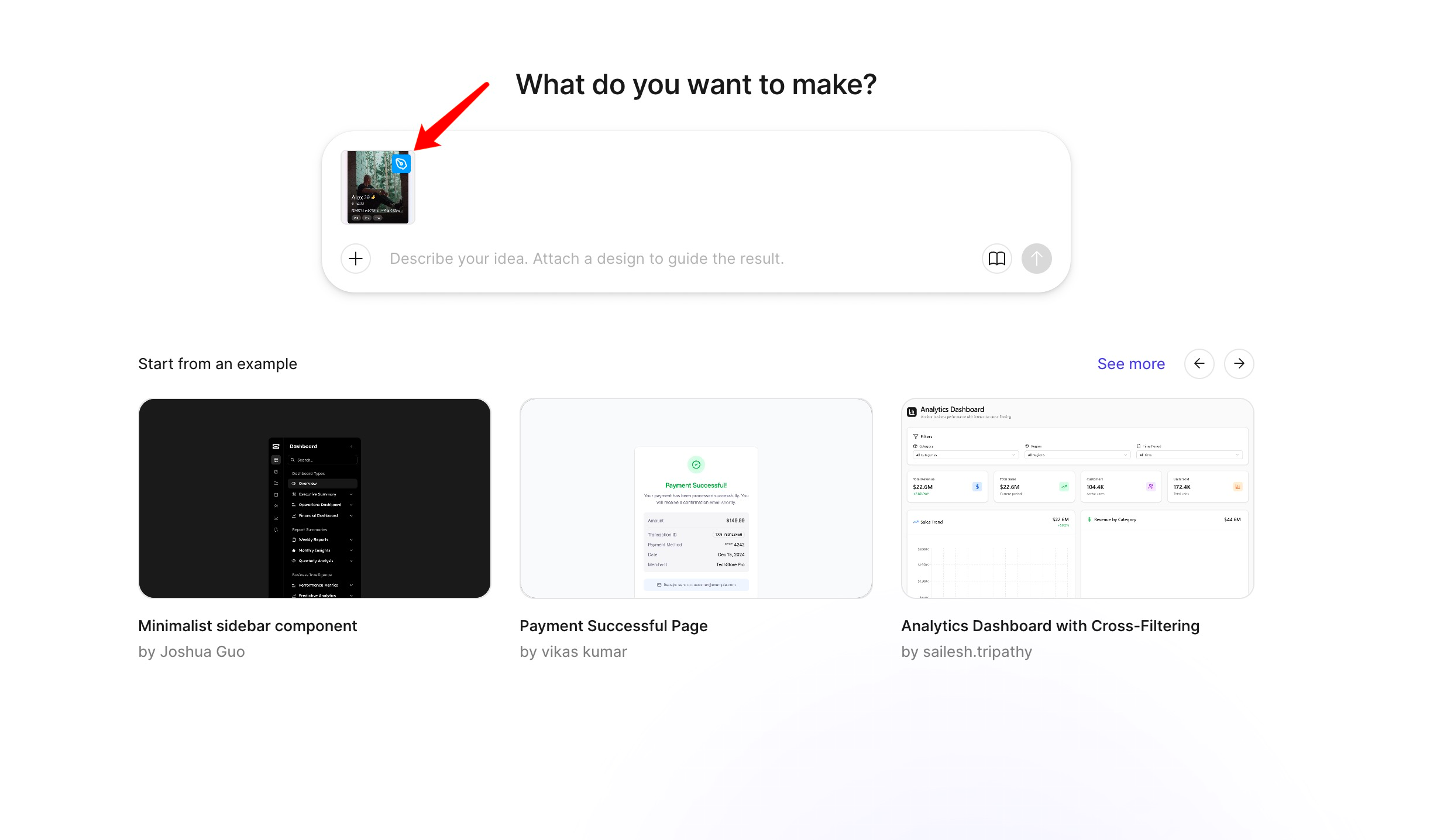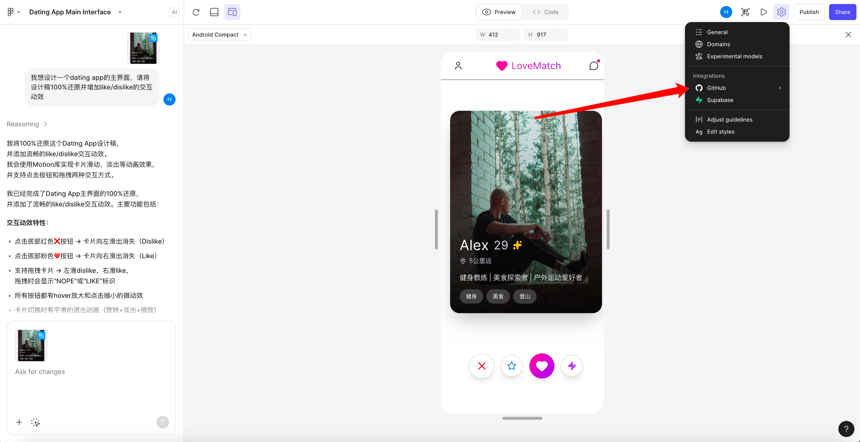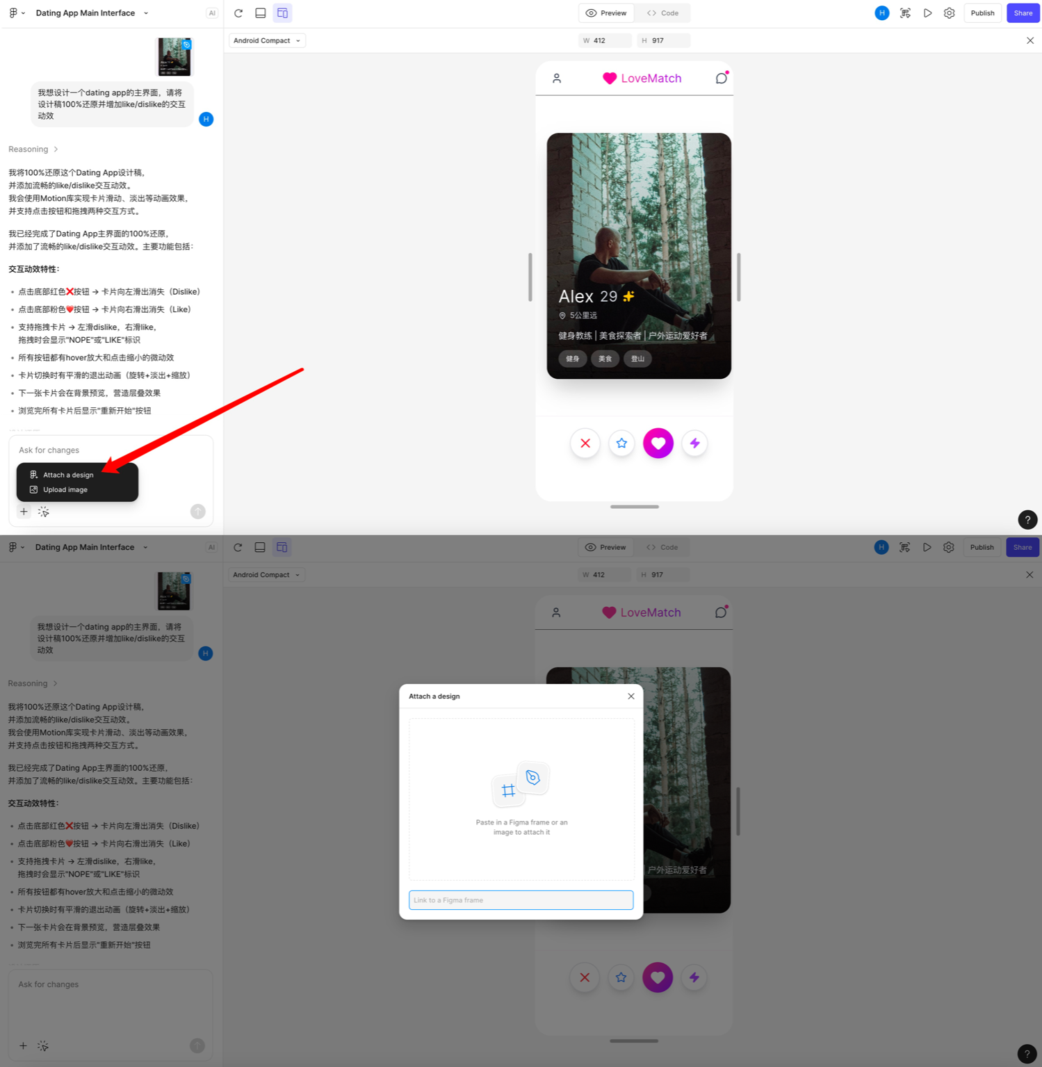 如果你要做页面跳转、状态切换、组件切换等交互,点击对话框左下角小「+」,选择【Attach a design】,会出现一个粘贴面板。此时去【Design】文件,直接复制对应frame,再粘贴回来,输入框上方就会出现对应页面(带蓝色小钢笔),继续对话让AI帮你完善即可。