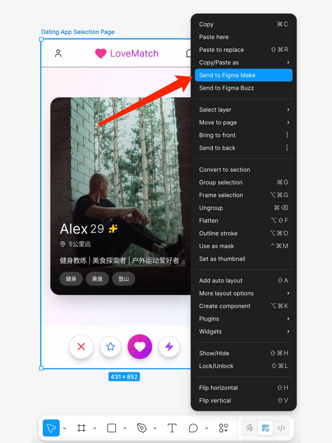 在【Design】文件中选中一个frame,右键点击【Send to Figma Make】。目前最多支持一次性导入3个frame,但我试了很多次,效果都不佳,还是建议大家每次只导一个。