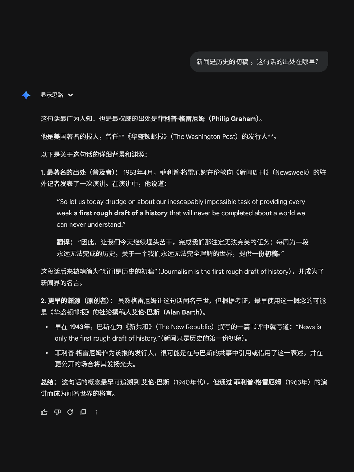 这句话出自《华盛顿邮报》的前董事长。它既是一种自豪,也是一种谦卑:我为你记录下历史的第一个瞬间,但我承认,在种种限制下,它是不完美的,它难免有遗憾。它只是一个简略的初稿。