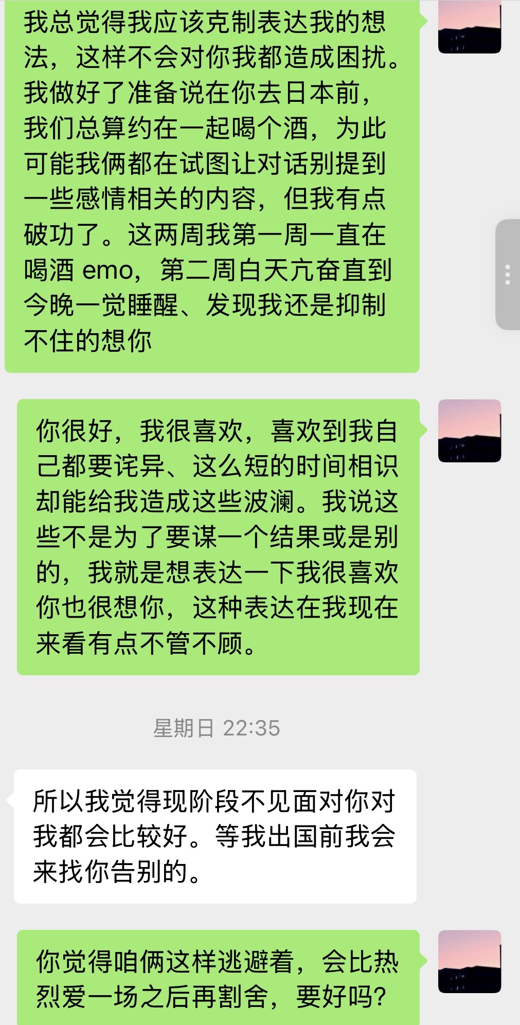 回头来看,之后的这些发展好像在 15 天前那个转折的雨夜就被我预料到,下一次见面会是他去日本前的和我道别,我也不再想规划这一次见面我们到底要做什么,灰寂的心情会把美好的回忆和想象污染掉。最后一次见面会是他在日本安顿好了,我去向他告别。这些年我总想求个长久安稳的关系,但我又足够成熟到能体面的结束,大家各自安好。可我放下理智的那些时刻里、我的难过又要谁来赔,也不过是自作自受罢哈哈哈