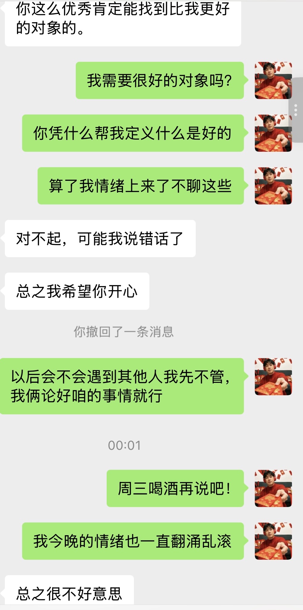 自上次见面的第一周我喝的昏天黑地,几乎每天都醉的,到没人的地方就开始哭,但还好也没哭上太多时间。上一周我总是亢奋,亢奋到周日爬山太疲惫一觉醒来我被翻涌上来的难过淹没了,我向他表达我的喜欢和难过,他给了我一个我知道的答案。我还说你可以拿我当朋友聊聊的呀,当时还在沾沾自喜、嘿他这样就会恢复以前一样了吧,但我们之间的相处并没有变化,我们变得越来越沉默。