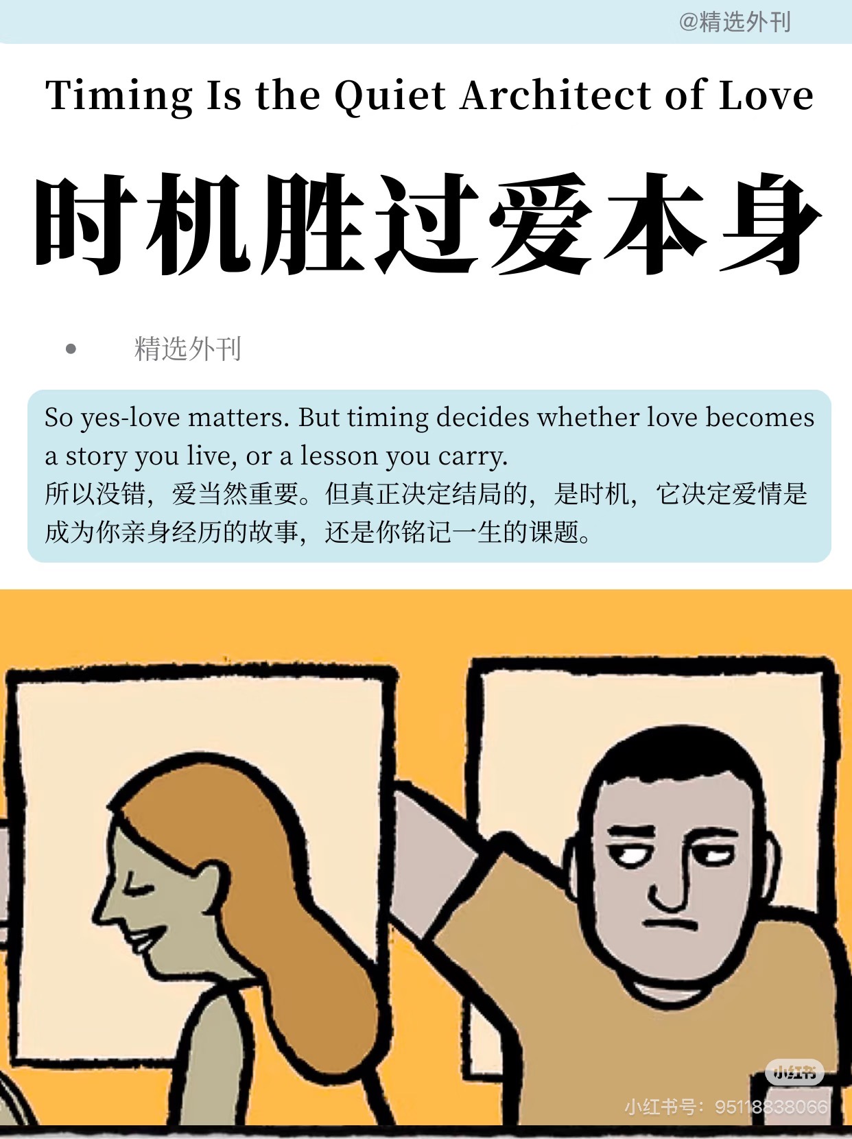 我现在唯一要做的,就是慢慢放下他,并且等一个不期而遇的日子去赴约。我想有一句话我还是得告诉他,不管是往前三年还是往后三年的任何时间点,再遇到你我仍然会再爱上你一次。这次我俩之间可惜遗憾了,但希望以后我们都会在对的时间点遇上对的人。当然你一直是我对的人。