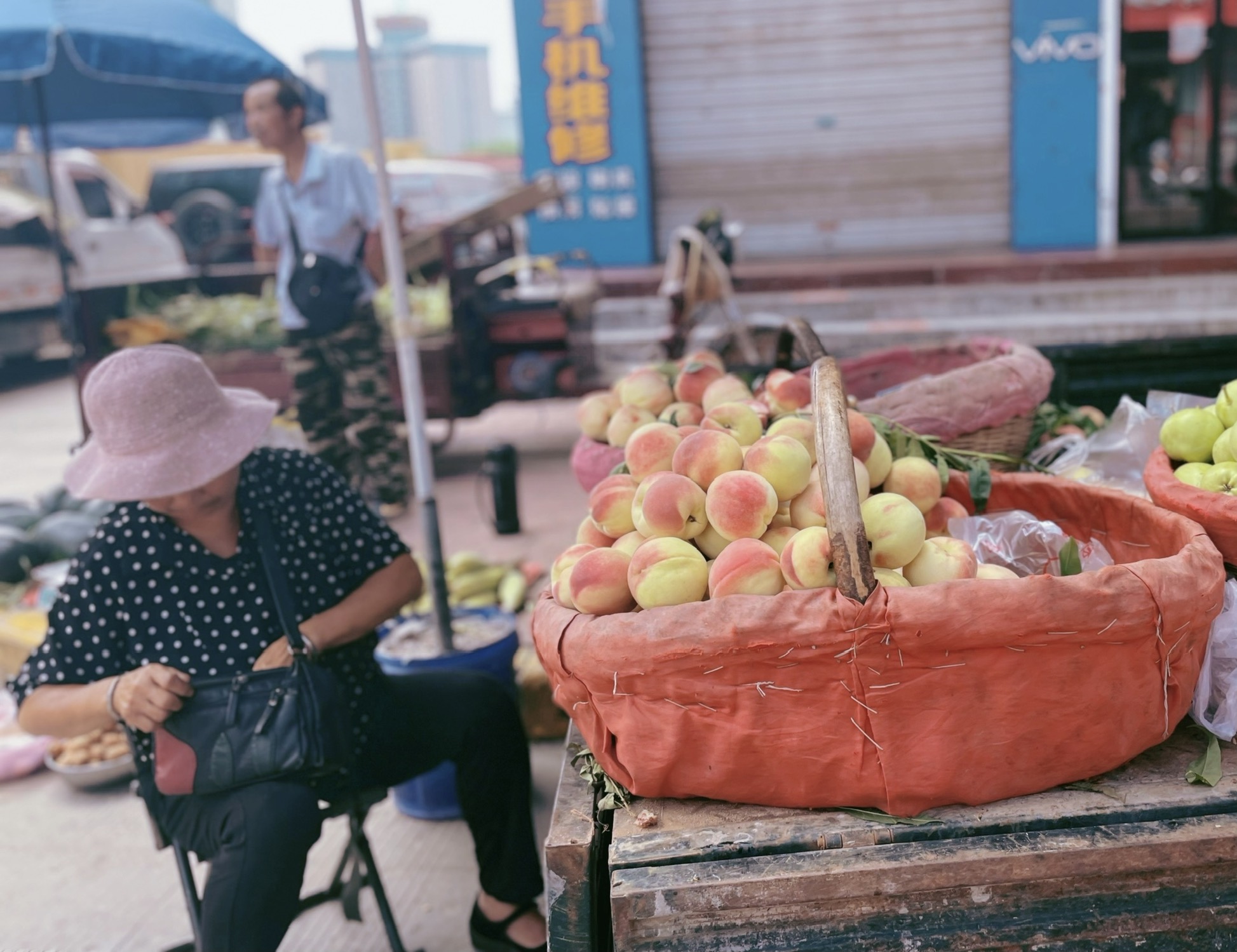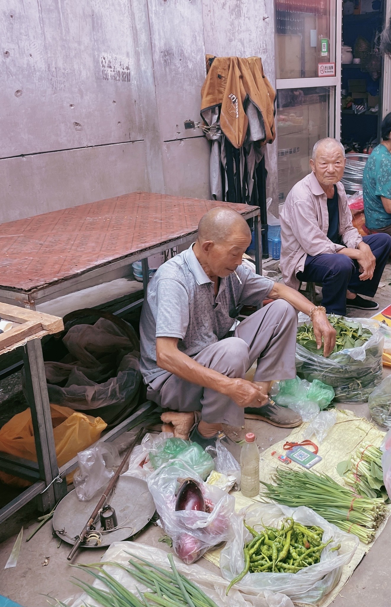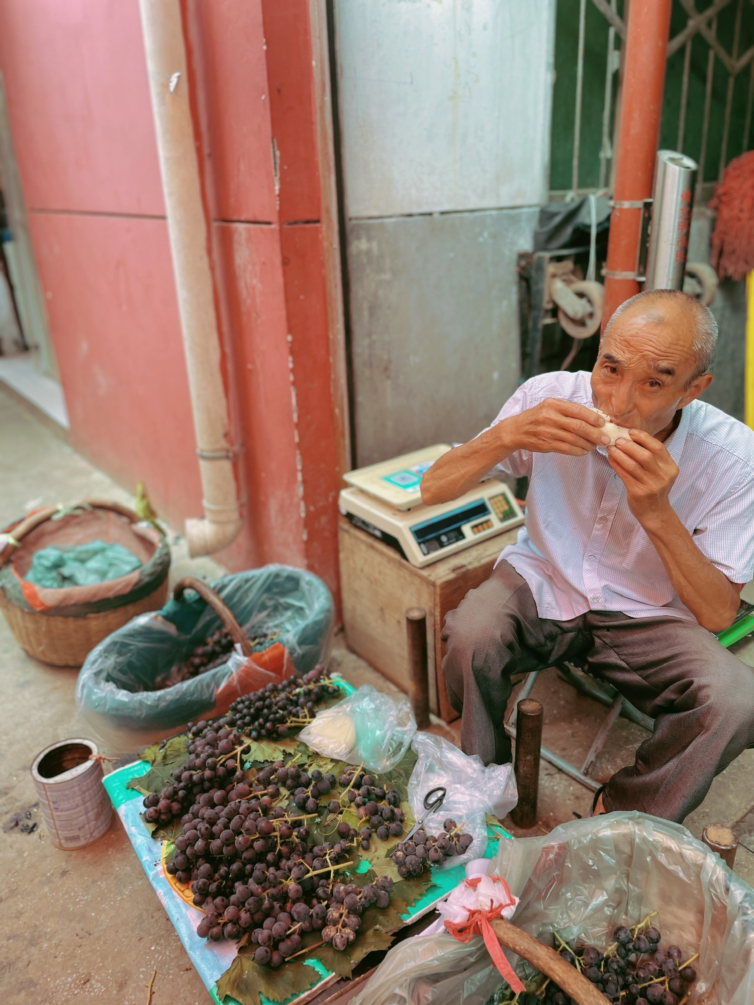 回家,被我妈拽出去买新鲜蔬菜。虽然周围有超市,各种社区团购(多多,橙心,兴盛)也在年初就打入了我们这里。但她还是喜欢周末的时候去菜市场里的村民小摊上买更新鲜的蔬菜。这些村民早上很早就从附近赶到城里,卖的好的人中午就可以回家,有些人要待上一整天。图一里的大爷的午餐应该就是那两个包子。有的大爷还在用秤砣。