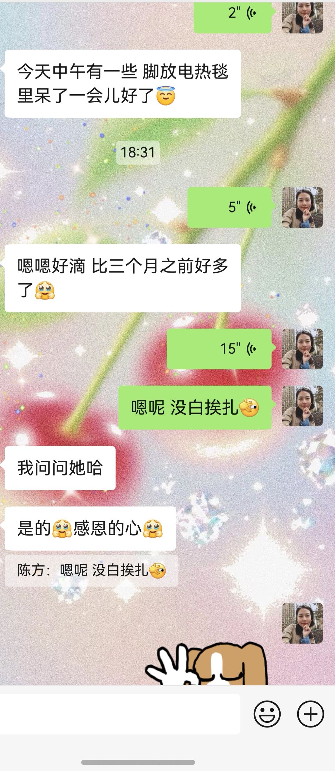 六诊:肩背疼痛减轻,肘关节偶尔疼痛,正常睡眠,小指红肿继续减轻,仍水肿但皮色恢复正常