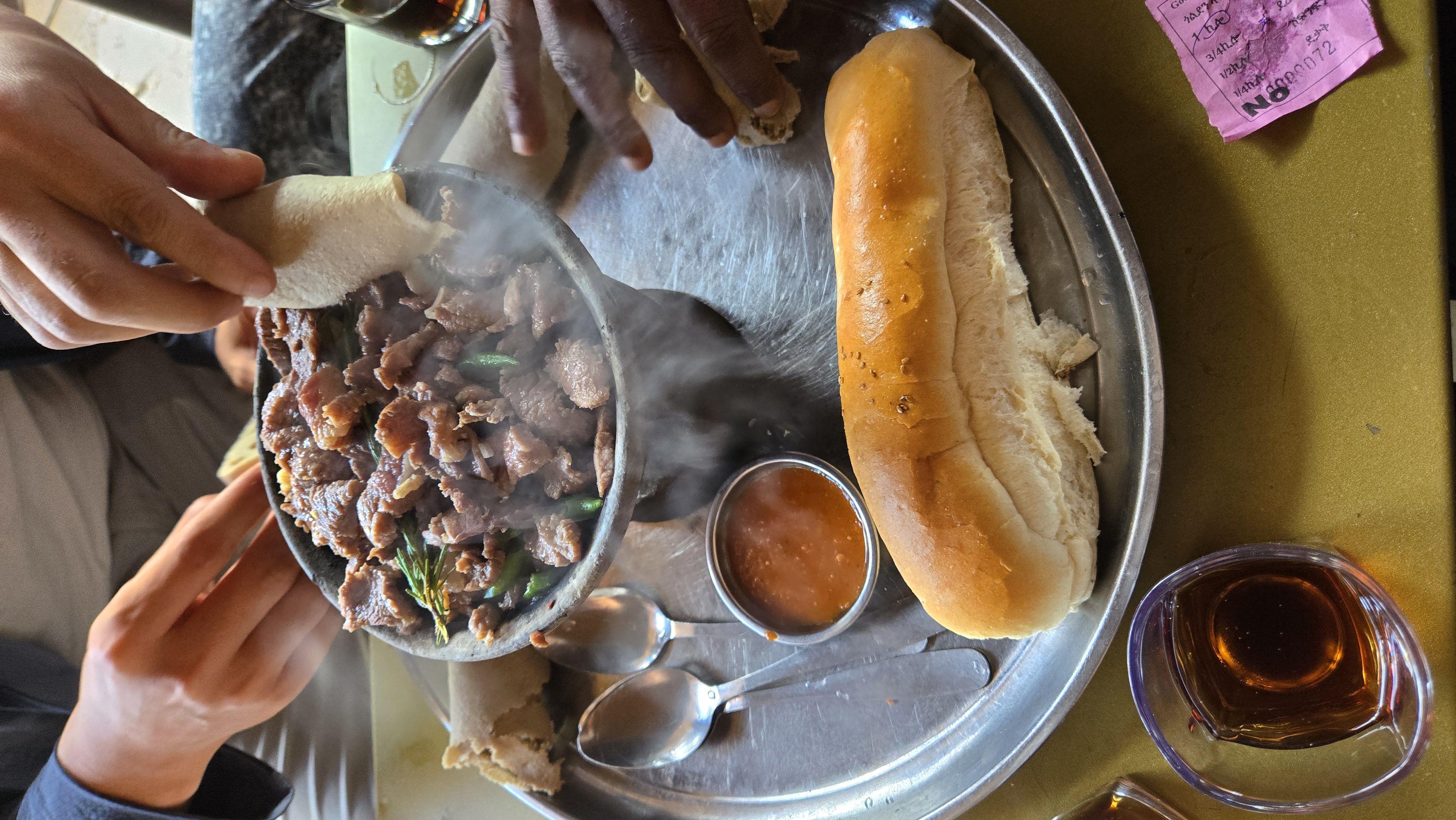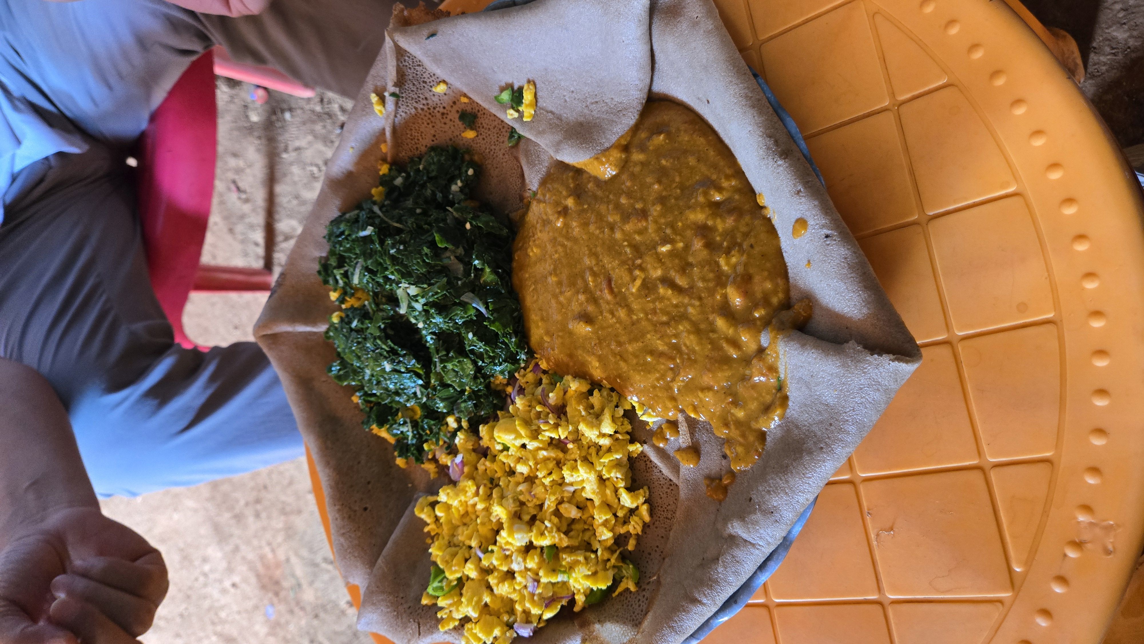 “英吉拉”是当地人用苔麸(Teff)面糊发酵过后摊的酸煎饼,是当地的主食,每一餐都用它卷各式各样的糊糊或者碎末(牛肉的,羊肉的,鸡蛋的,蔬菜的,番茄的,豆子酱的)。刚开始吃还可以,直到每一餐都有它。当地的牛肉真的很好吃,纯种草饲黄膘牛肉,而且很便宜。