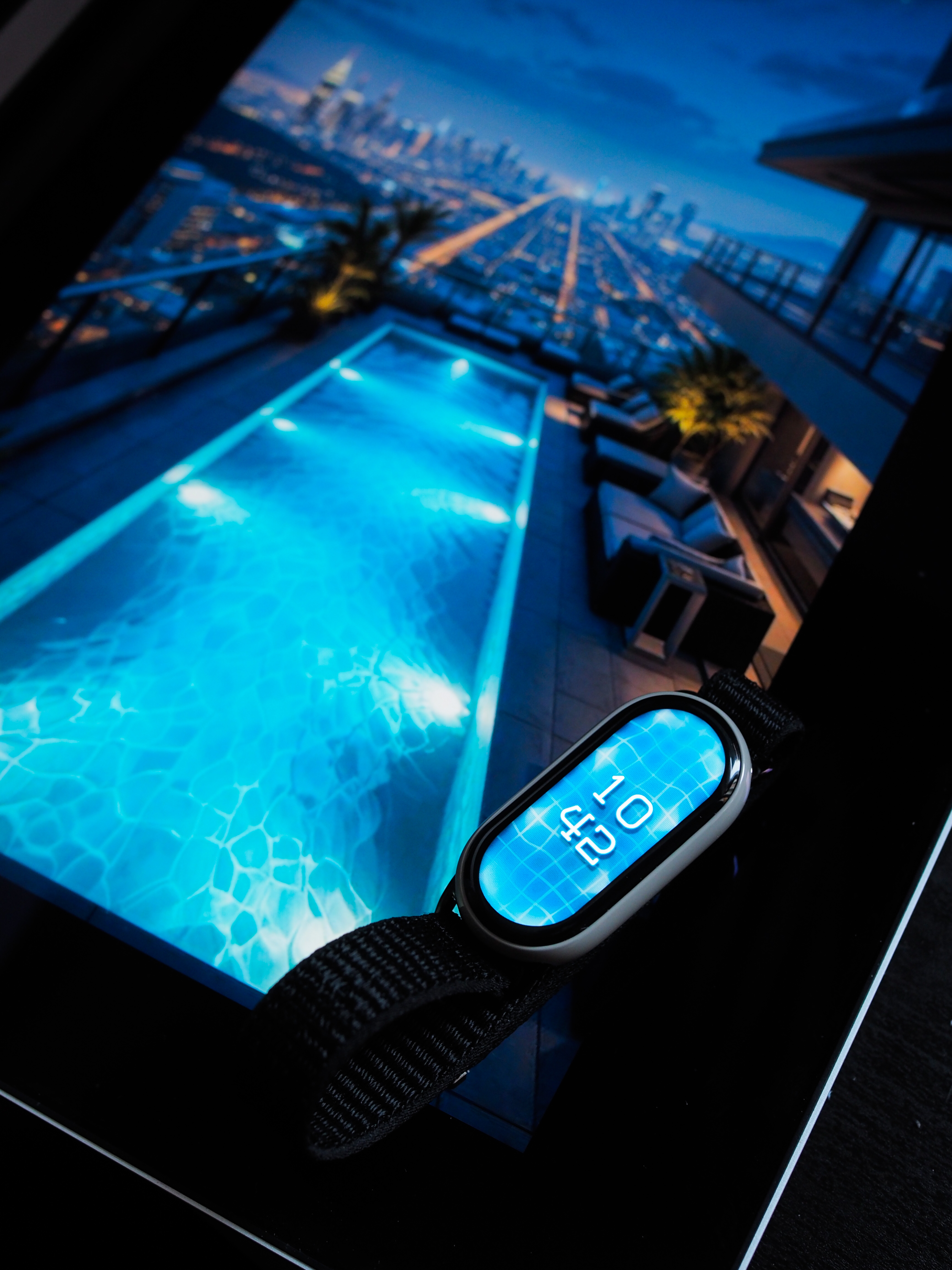现在这个表盘非常简单:蓝绿色的泳池背景、马赛克结构、柔和的光晕,中间是 24 小时制的时间显示,同时完整支持息屏显示。没有复杂功能,也没有刻意的炫技,它只是一个克制、安静、朴实无华的泳池。