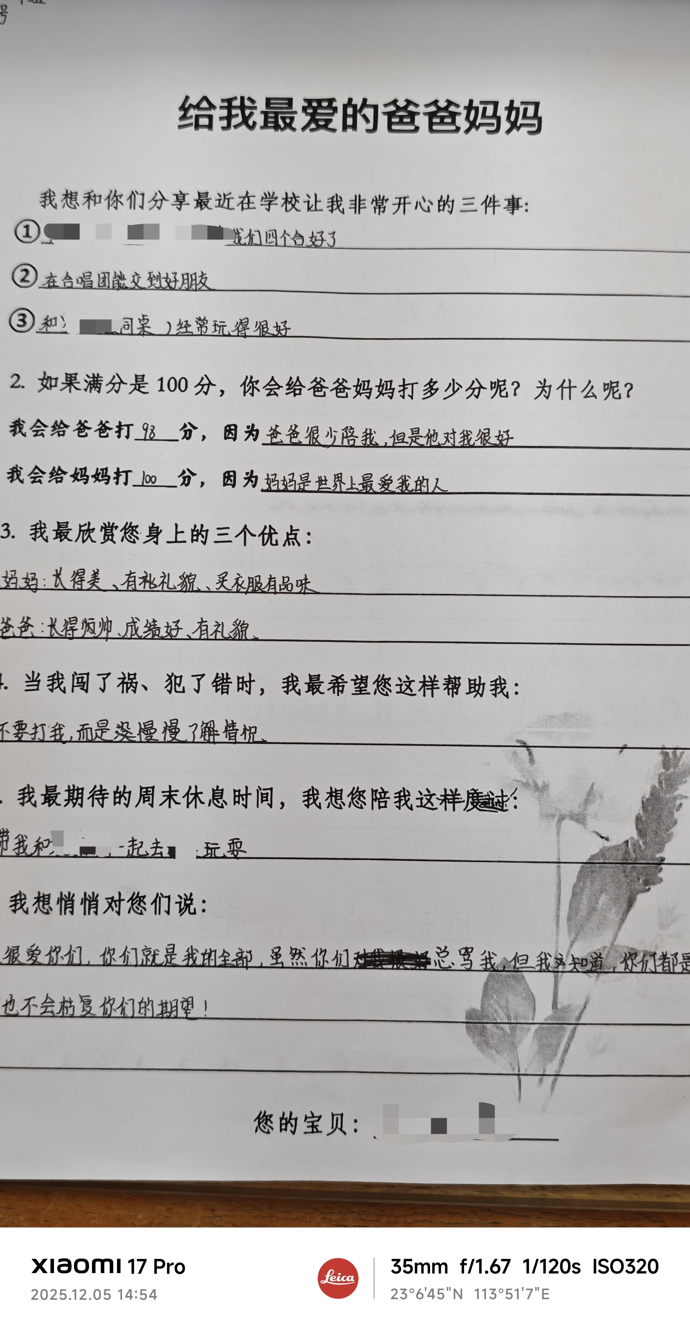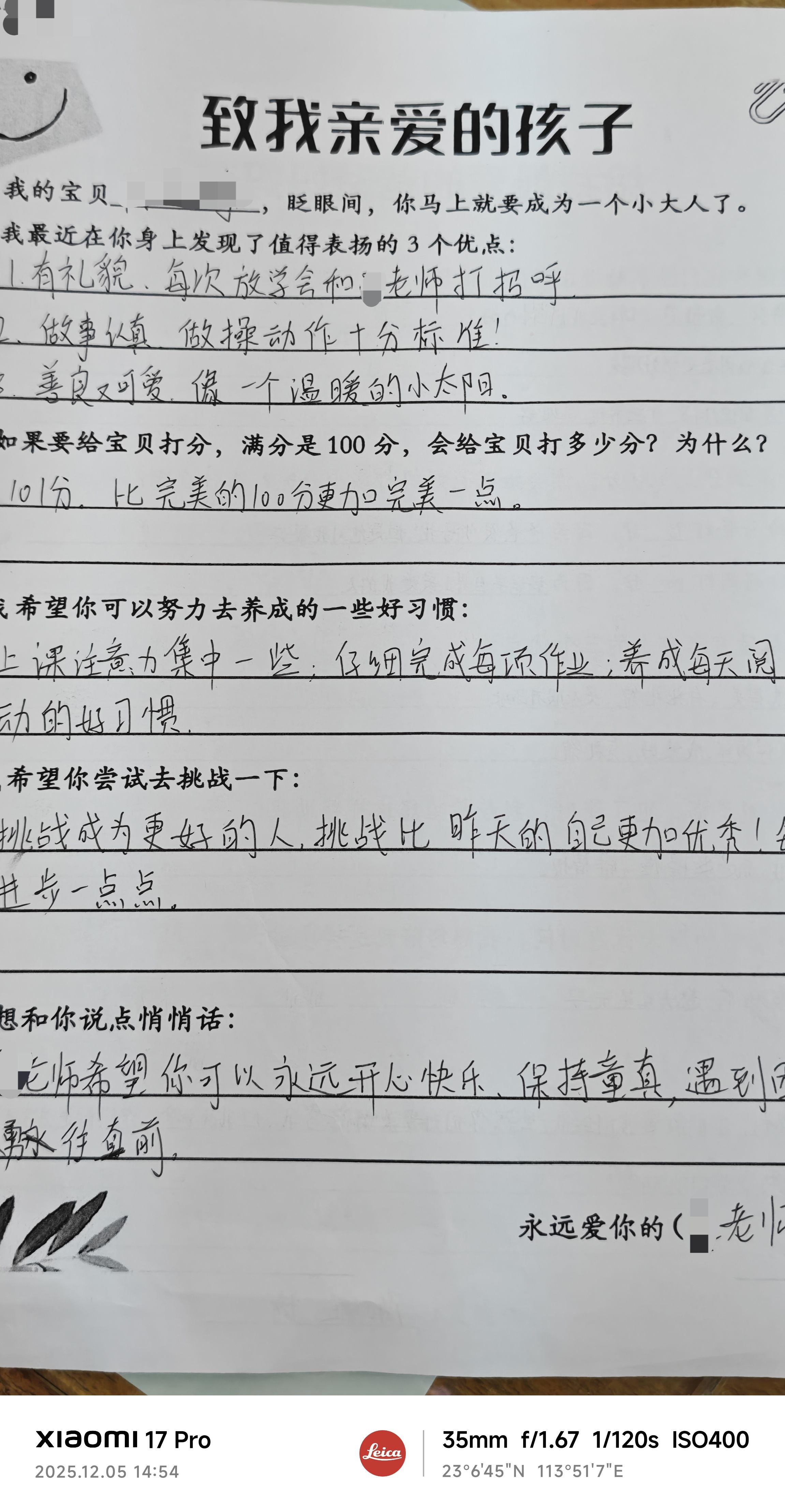 昨晚开家长会孩子没有家长到场,她认真写的信也没有收到回复,今天来看见她闷闷不乐,后来我就让她把昨天晚上这张纸交给我,利用中午午休时间给她回了信,孩子下午上课的时候抱着信一直给同桌炫耀,脸上的笑容就没断过。