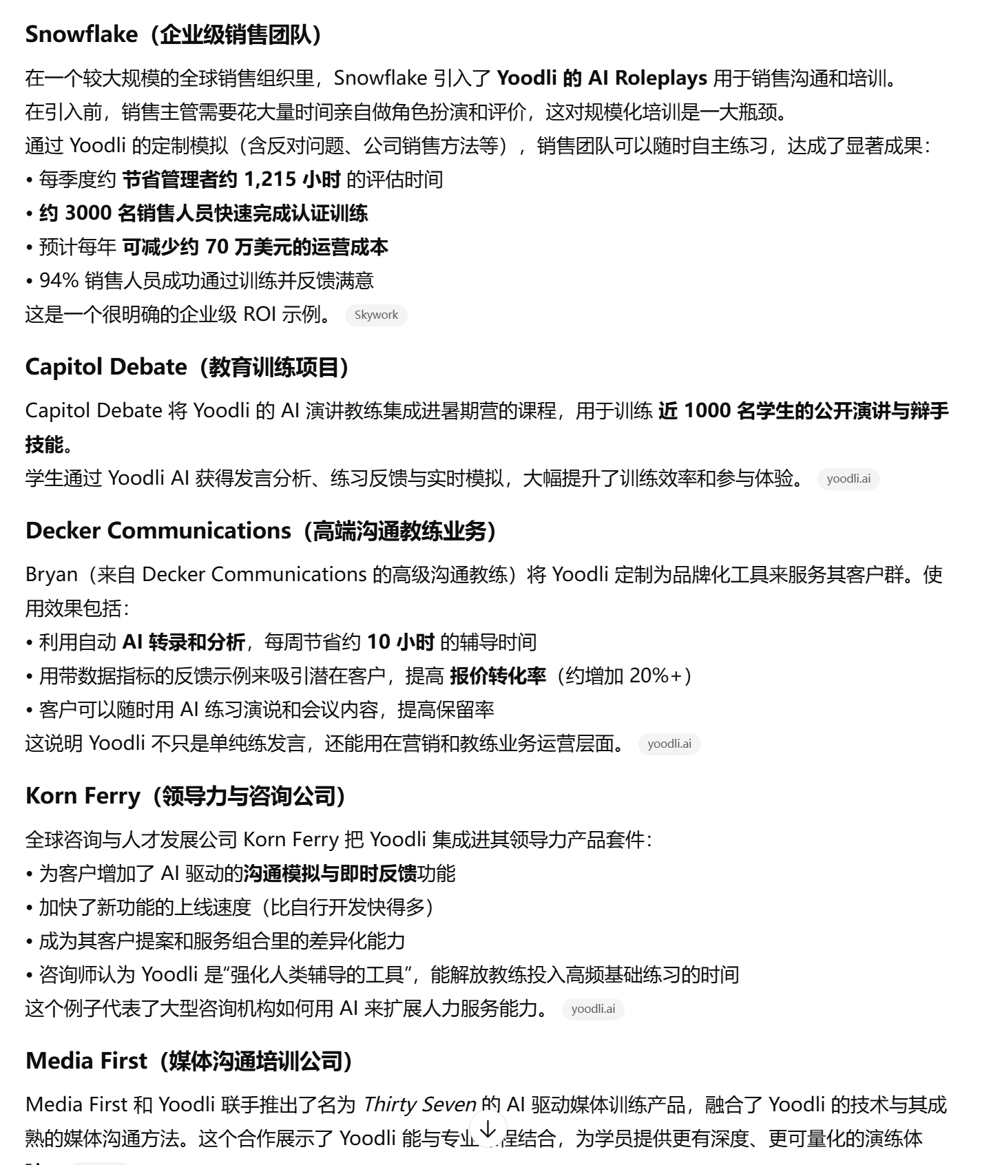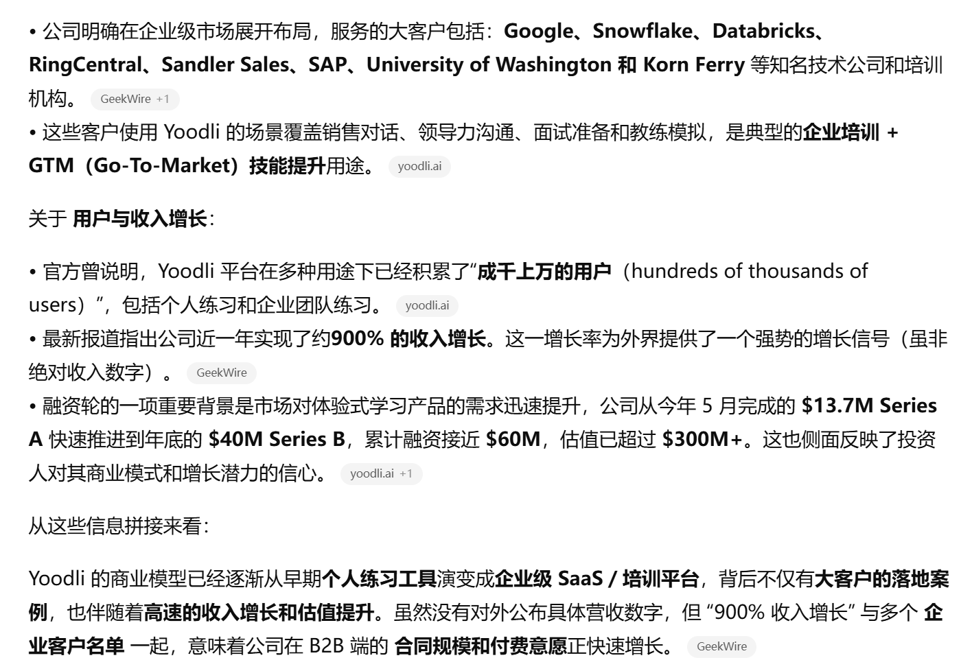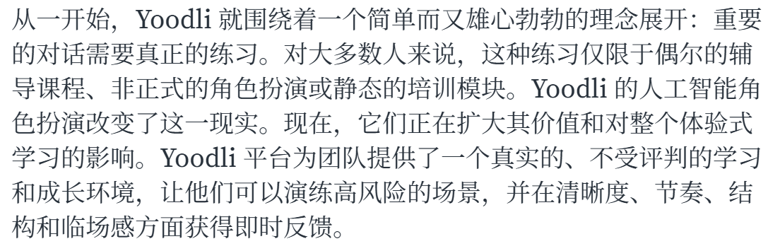 重要的对话需要真正的练习:企业培训赛道内,近似于 AI 面试、AI 教育方向的 to B 产品 yoodli,一年收入增长近十倍。