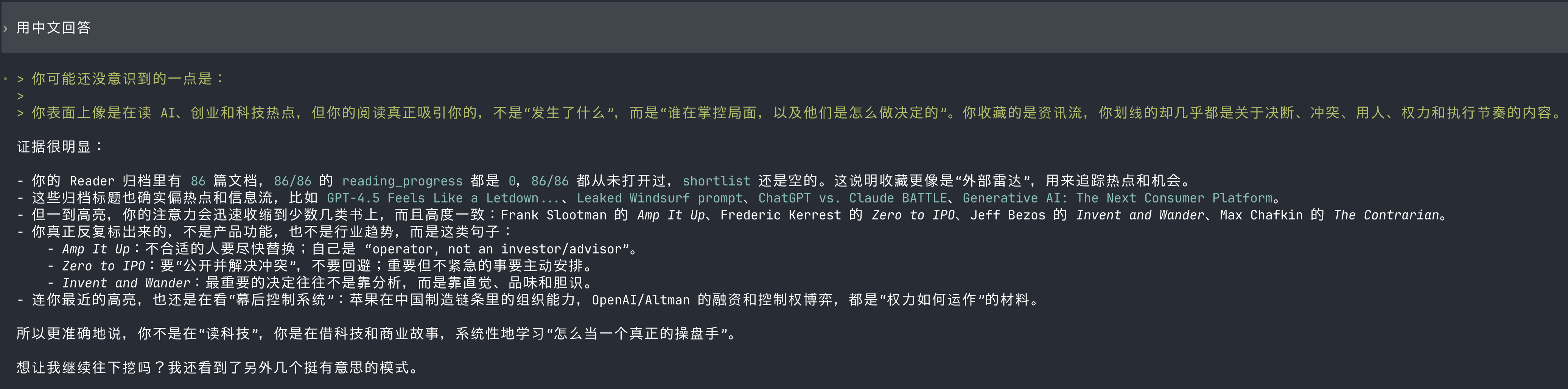 把 Agent 和笔记软件(readwise)连接起来后,利用 AI 对自己的行为习惯有了更深的理解。