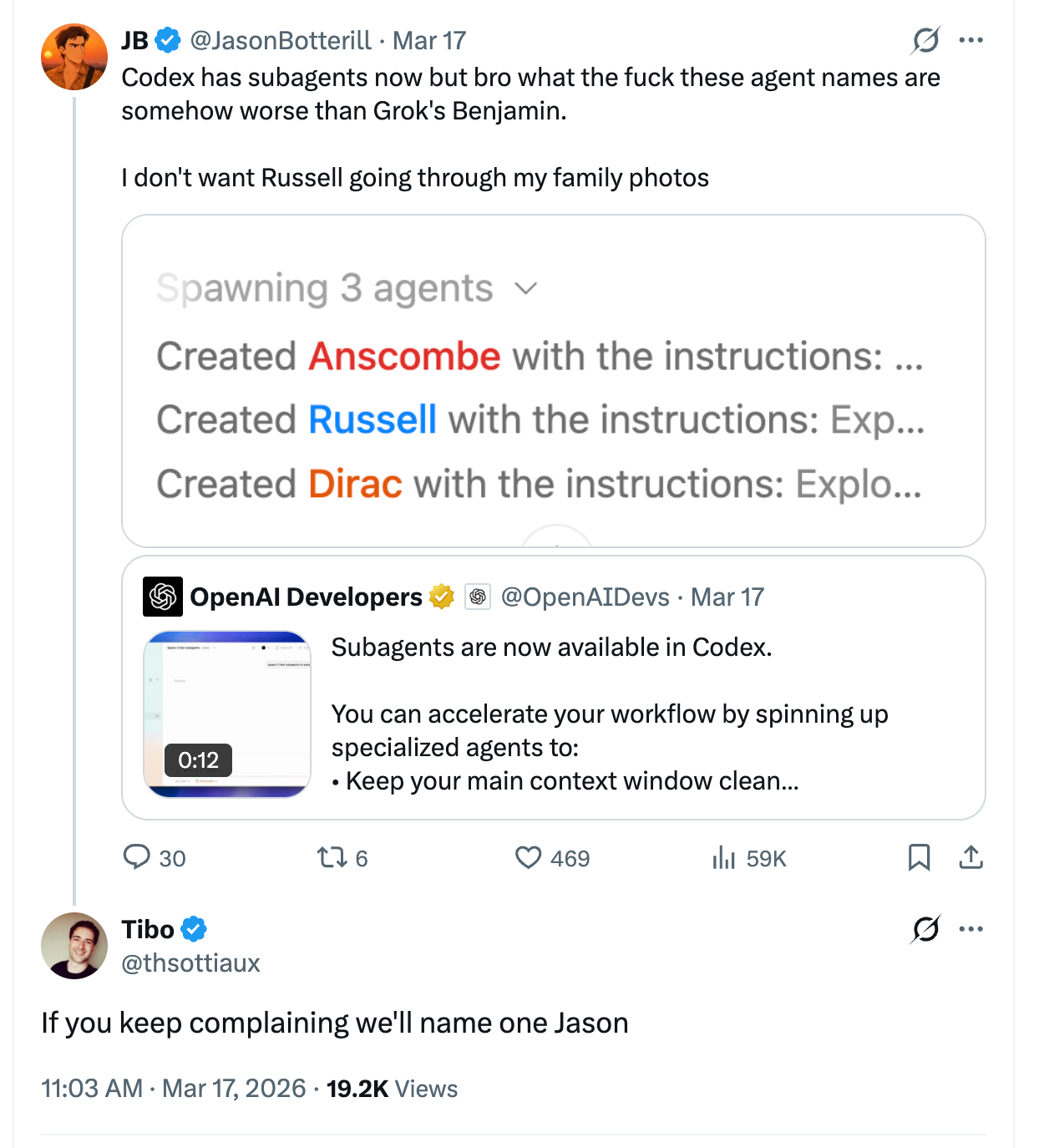 Codex的sub agent的名字都是一些名人,比如说牛顿,孔子,孟子什么的。有一个人吐槽这些名字不够现代,然后OpenAI的开发团队真的把他的名字Jason加到了这些sub agent的名字列表里面。