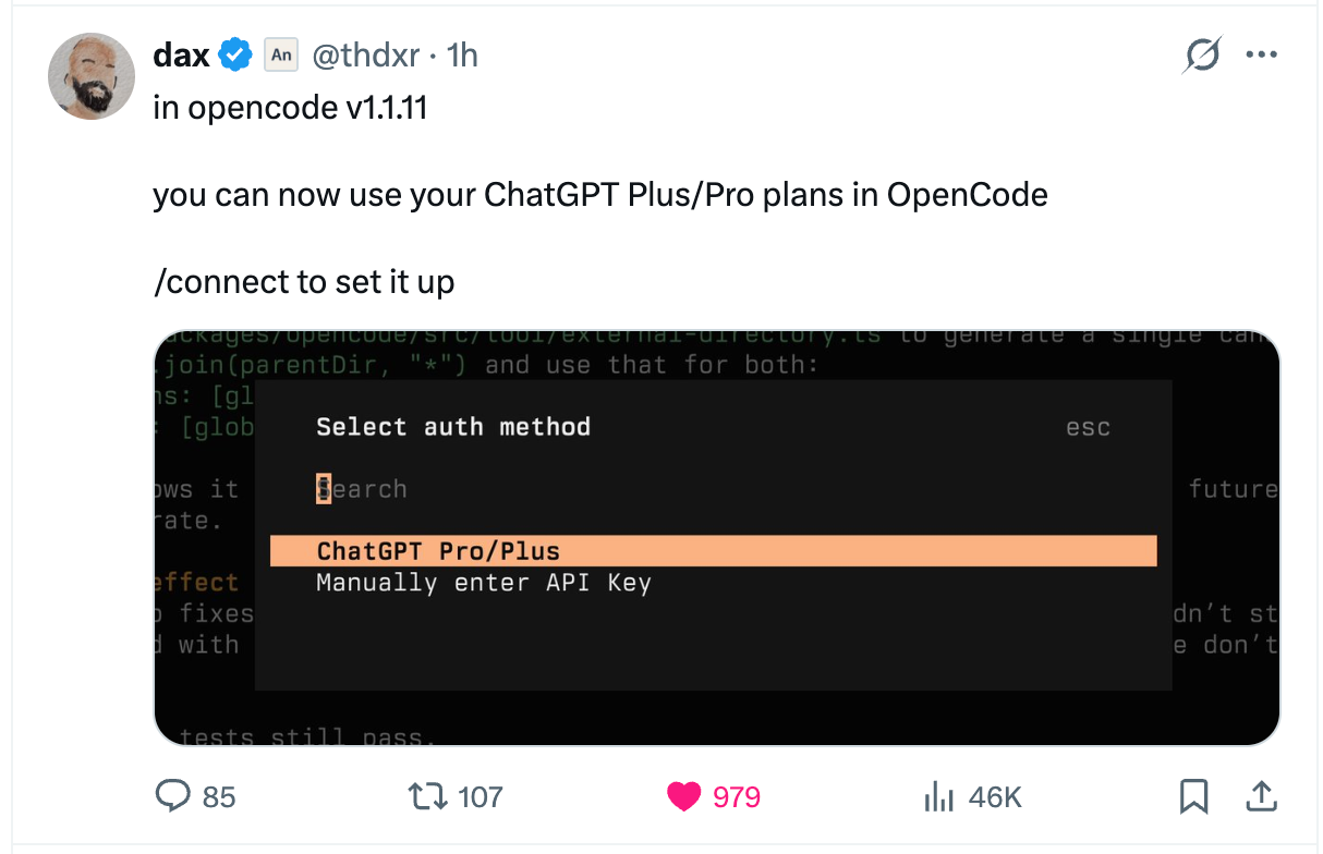 opencode 里面可以用 ChatGPT 的个人订阅了,真的方便