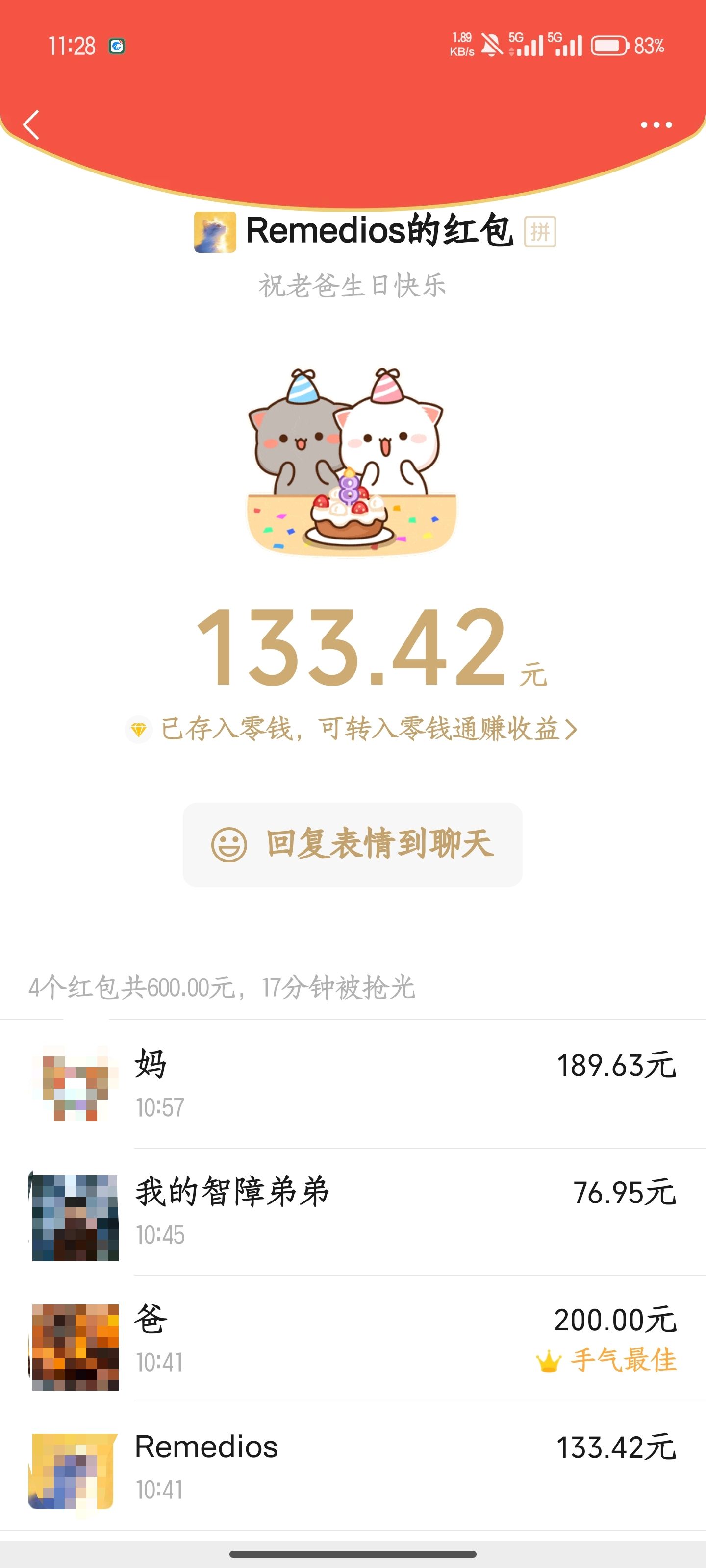 我爸过生日我本来想给他发200红包,但又希望家里每个人都有红包领,于是就发了600,结果我爸刚好抢到整整200,绝了