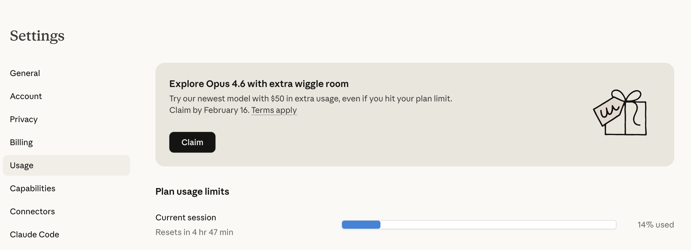 Claude打开settings/usage页面可以兑换$50的credits!