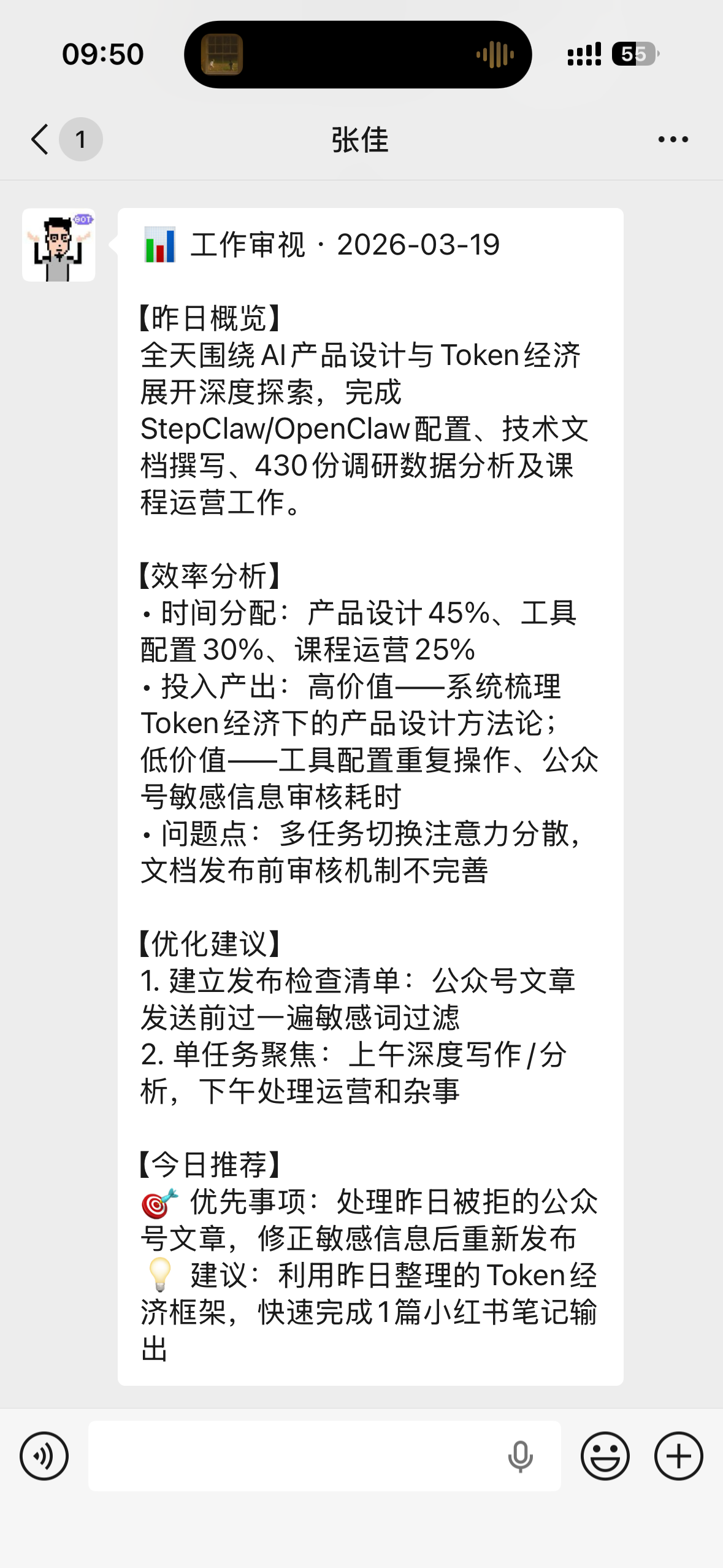 另一个“监工”定时任务是每天早上刷一遍前一天应用总结的活动日记,如果发现有时间投入性价比特别低的活,从详细记录日志里把相关任务的信息检索出来分析一下咋回事给我一些意见。