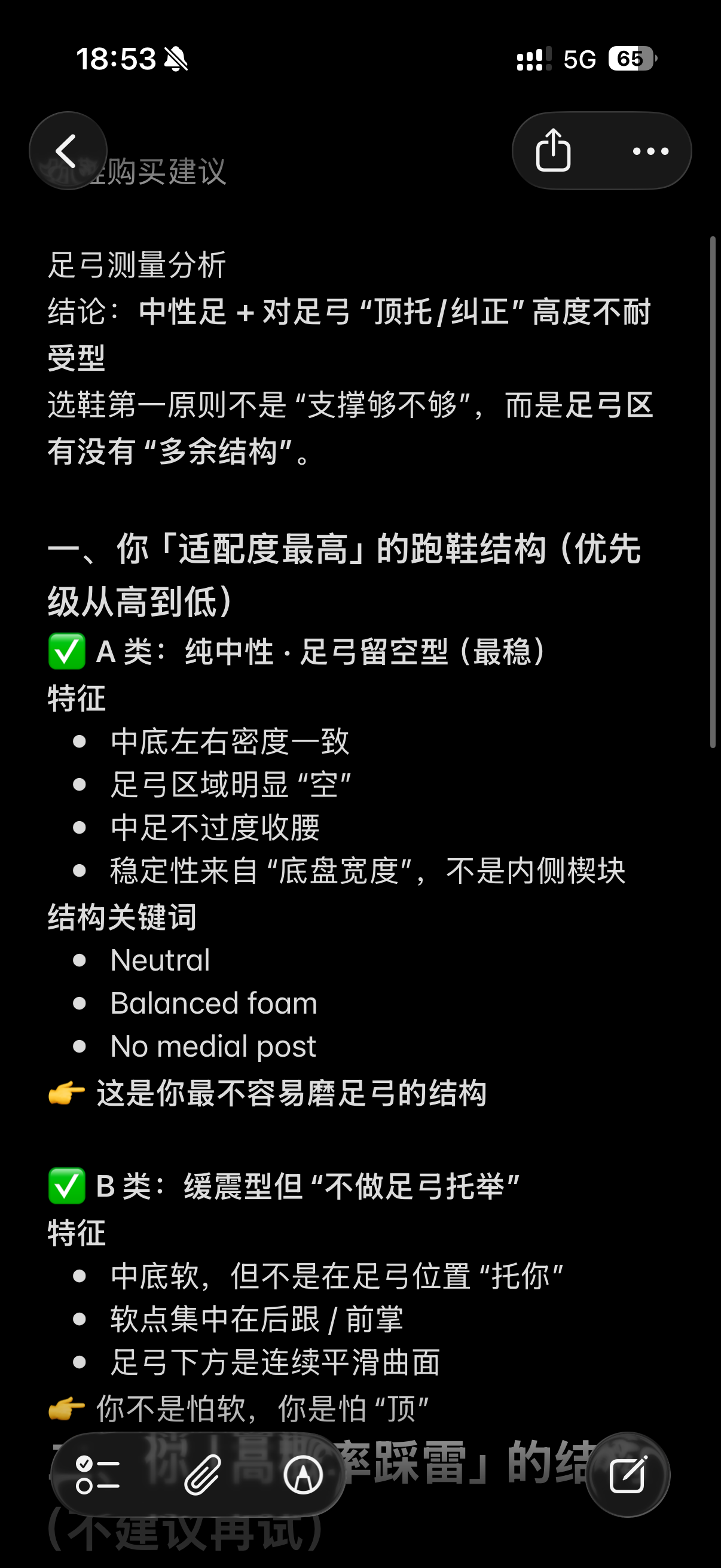 拿着Nike 001店里测的足弓报告找AI聊了下,一整个建议我别买Nike专门的跑鞋。 适合买非强支撑性的跑鞋。
