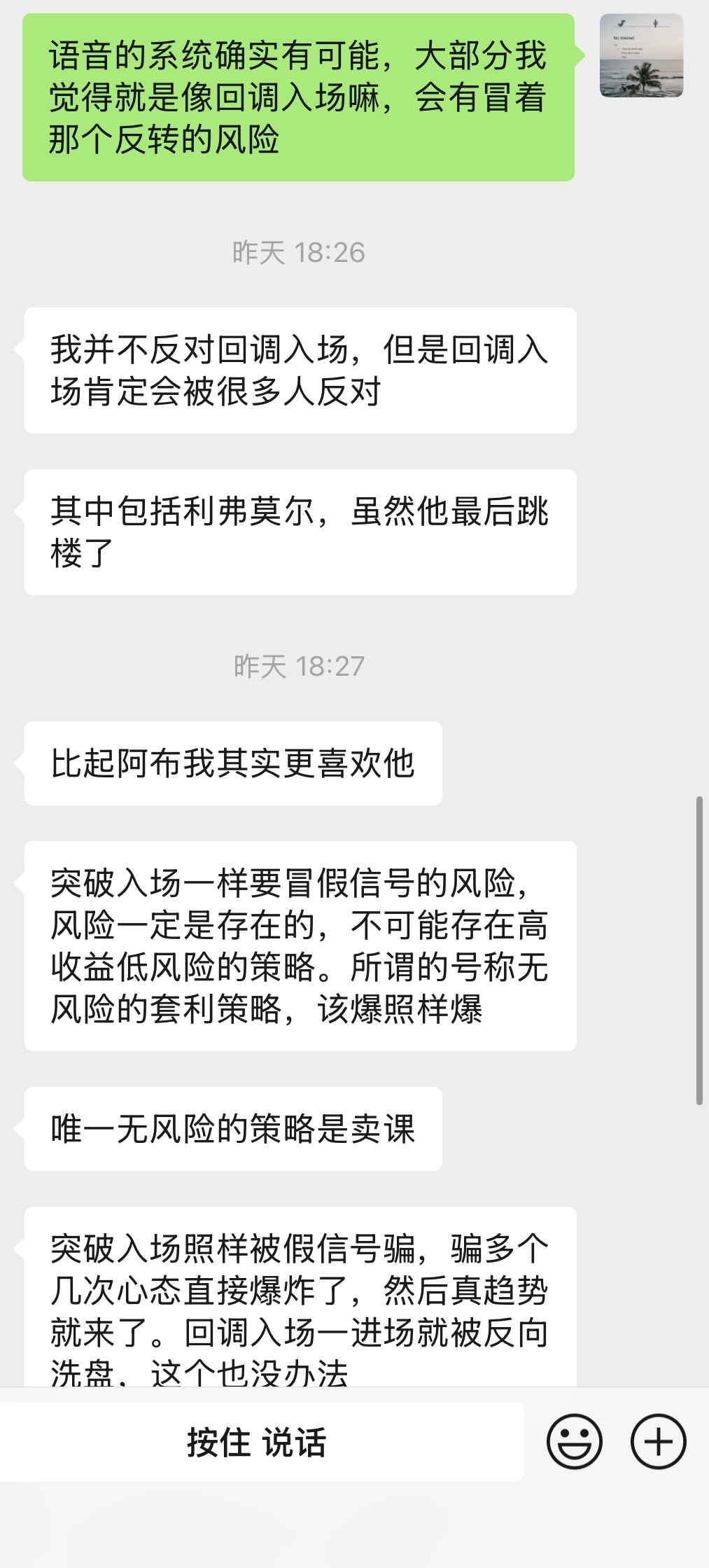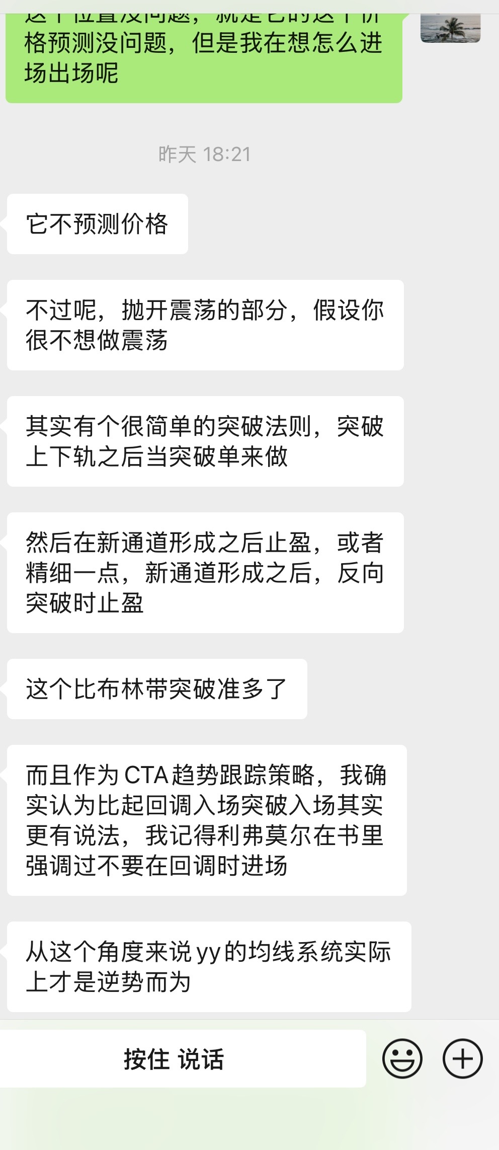 朋友看不进去albrooks价格行为的书,昨天给他讲了我的理解。我说美国人写文章很啰嗦,但是都很实用,没有专业的术语,没有显摆的迹象,一味的想教会你如何做正确的事,你不花比别人的时间和精力去研究,你凭什么能赚钱。然后群里跟另外的一个朋友讨论他即将完成的量化系统。我跟我朋友不一样,我喜欢阿布的价格行为分析,但我更钟爱利弗莫尔的绝对纪律性。