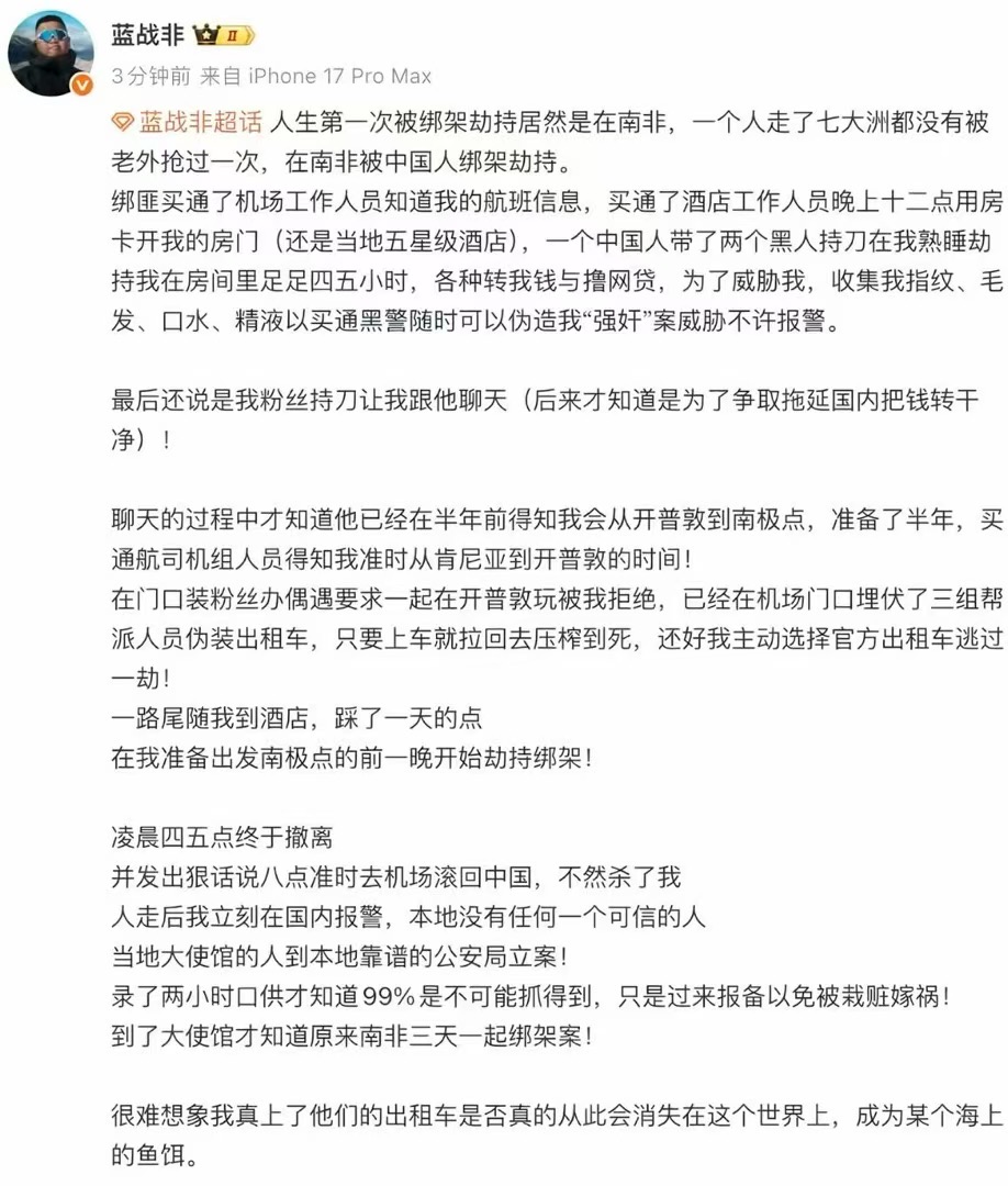 我还纳闷这种明目张胆一个人在非洲畅游的家伙怎么没人敲他一笔,现在绑架案终于发生了,不是不报而是时候未到。整件事其实很像是仙人跳,时间晚上12点,工作人员(可能不是工作人员)酒店房卡开门,劫持转账,一气呵成,所以大概率他没说全。还有一个问题是很多人疑惑的,为什么异地ip加频繁银行转账不会被风控,由于我国内卡里没那么多钱,我不知道🤷。但是我偏向于是仙人跳,因为绑匪是不会取精液的。国外仙人跳的关键证据一步就是取精液,国内一般到不了这一步就开始威胁了。有需求很正常,估计就是倒霉罢了。