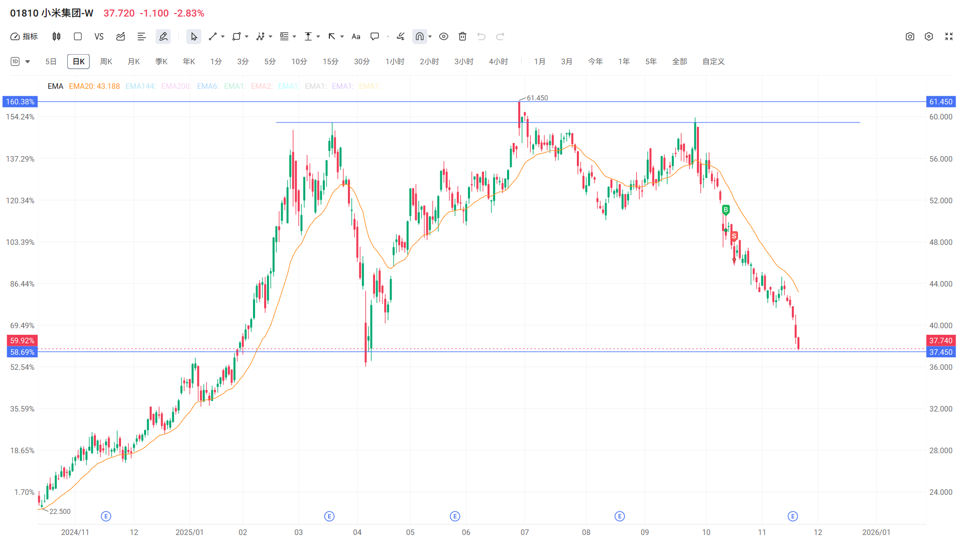 一个月前我就预测小米会有一波大回调,试过在49抄底,情况不对立马抛了。今天也是如期而至了,下方支撑位36-37,短期预计会横盘一阵子或者有可能一波小反弹,下方买盘如果量不够,小米算是年收益率连大盘(上证指数涨幅15%)都跑不过的垃圾股了🤣。这次下跌,更多的是情绪恐慌抛盘,就看有没有机构进场护盘了坐庄了。有朋友在高位55加仓了,整了几万,劝不动我就再也没劝了,炒股是需要安全感的,你的安全感从何而来?🤷