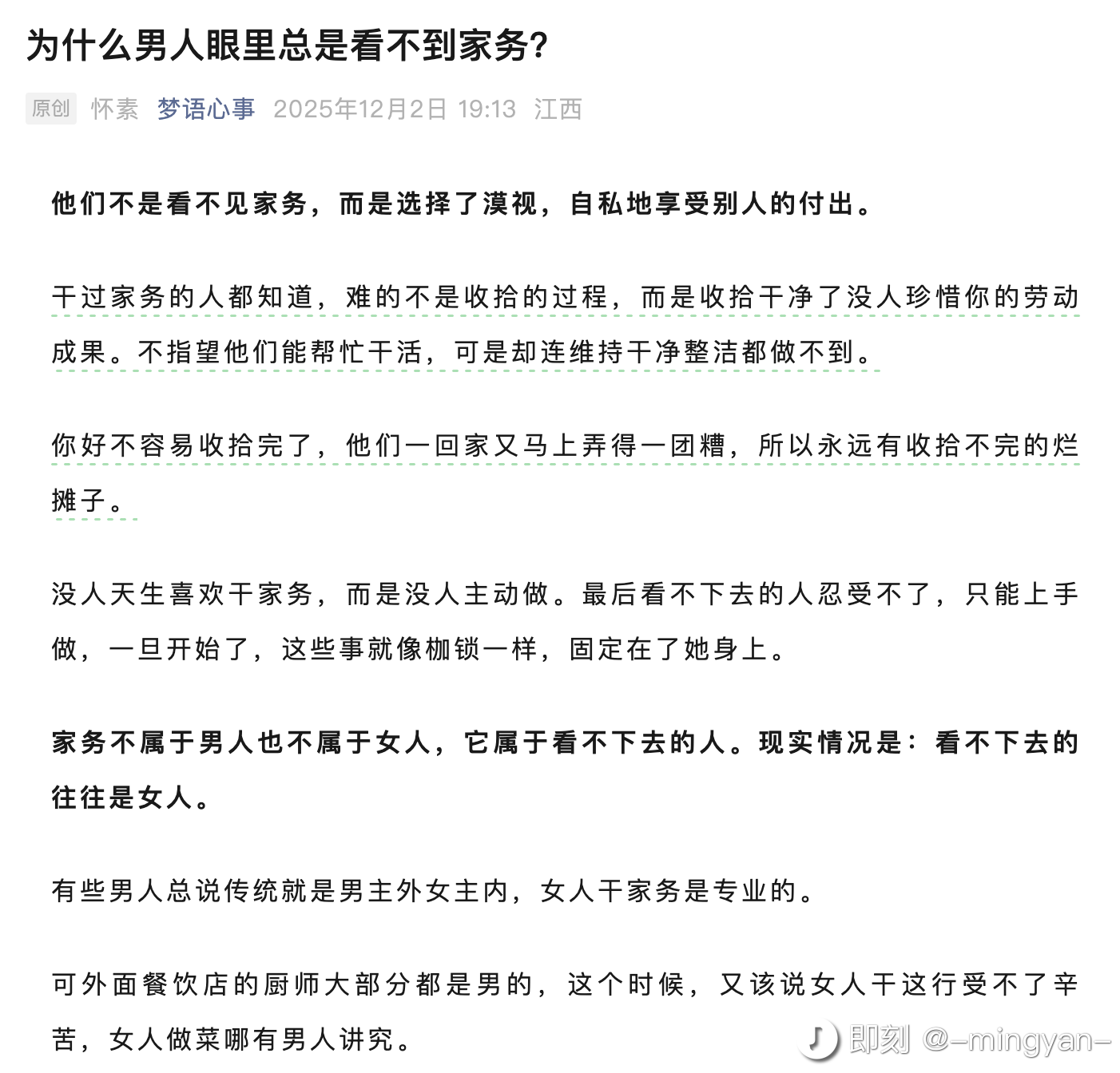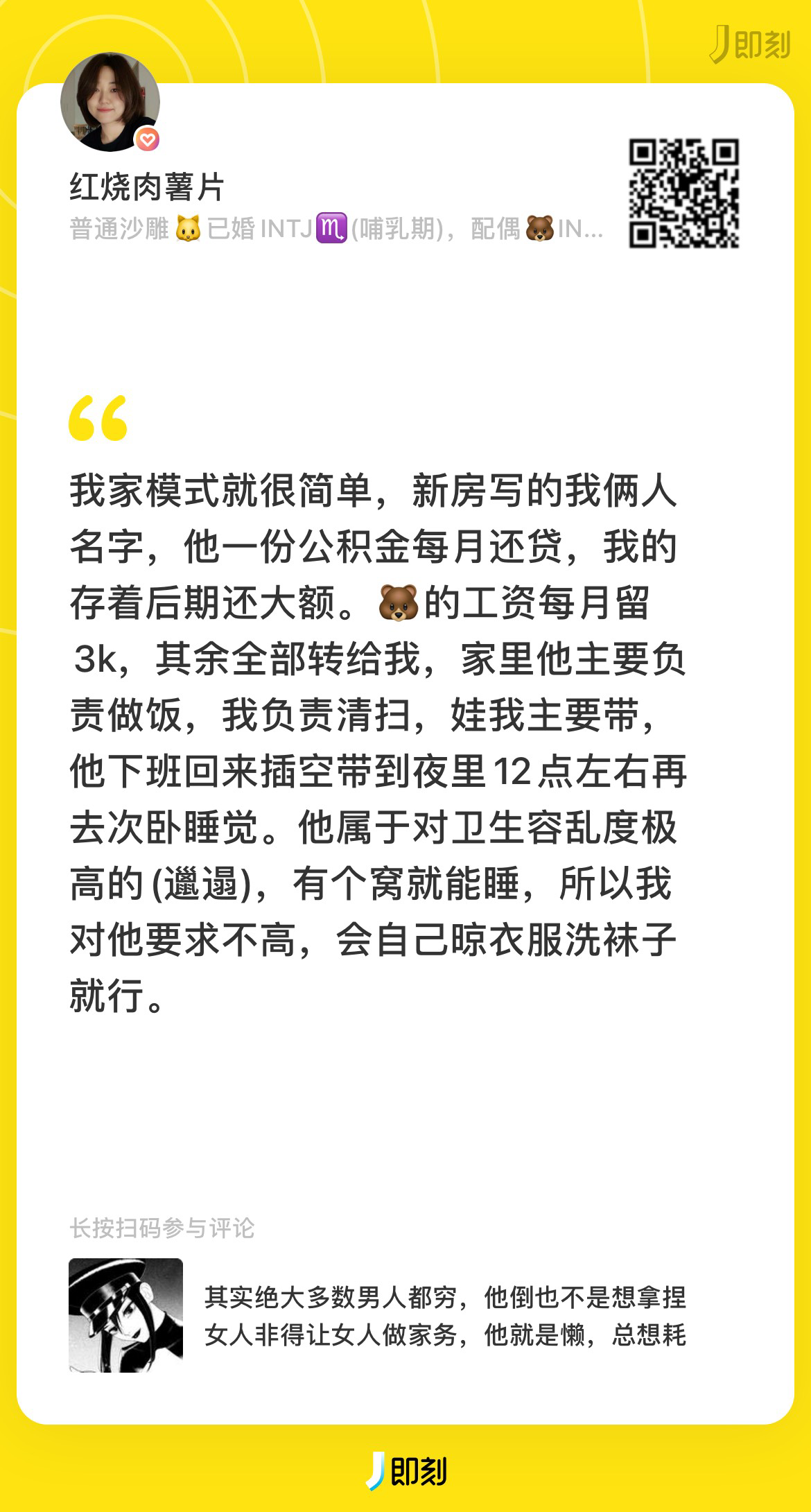 再有大概率来讲,我们当下的环境大部分人是穷人,很多是赚不到一个月三万的,三四线的两口子两人加起来能到一万这也都常规水平,所以我感觉原作者面向的群体更多是这类,换做是我,我一个月如果只能赚五千,他一个月赚一万,然后他直接甩手掌柜,我也是会抱怨的,你又不是赚三四万,家里经济大部分都是你一个人承担,我赚的跟你比真的不算啥,你让我一个人做家务我是ok的,哪怕上班再累我也忍着,绝对不得罪我的金主老公