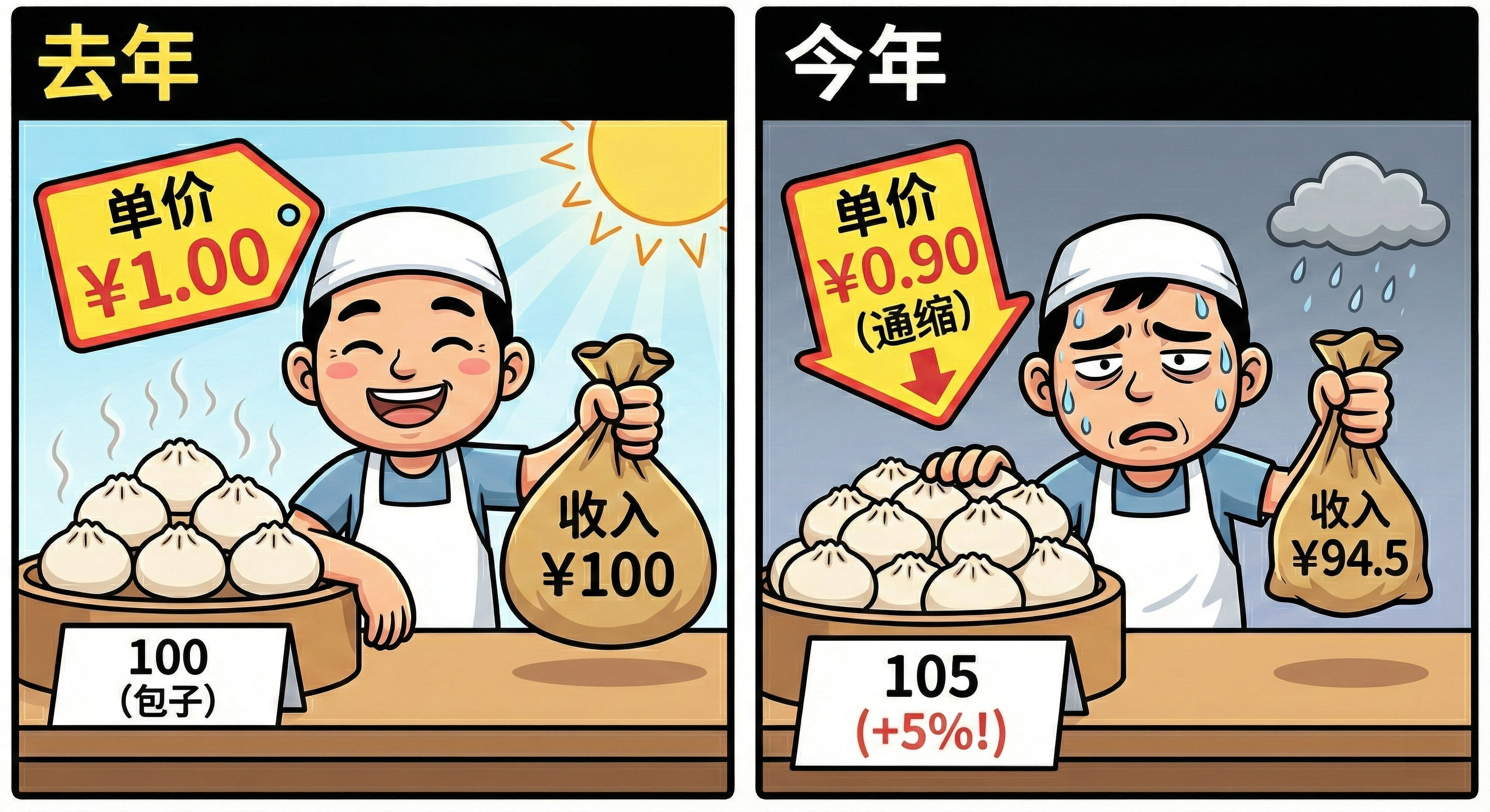 去年你卖 100 个包子,单价 1 元,收入 100 元。今年你更努力,卖了 105 个包子(实际 GDP 增长 5%),但因为通缩,单价跌到了 0.9 元。结果你的总收入变成了 94.5 元(105 × 0.9)。