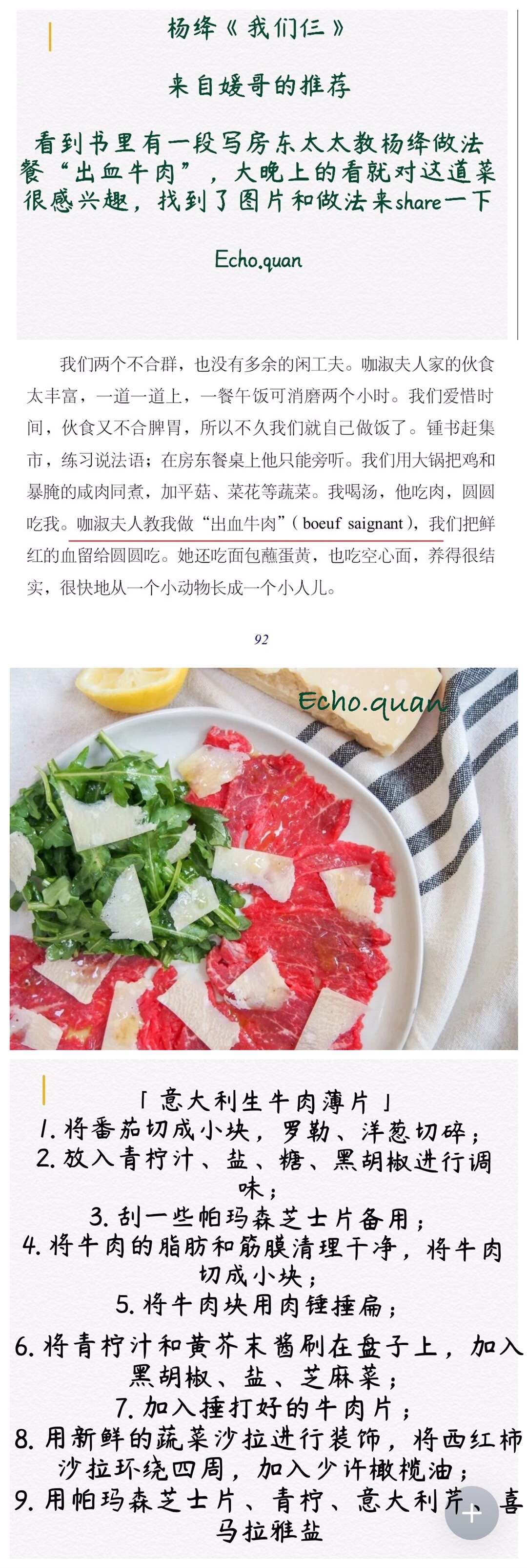 读了朋友推荐的书-来自杨绛先生的《我们仨》从书里还整理了一道菜谱。书中有很多温馨的小细节。