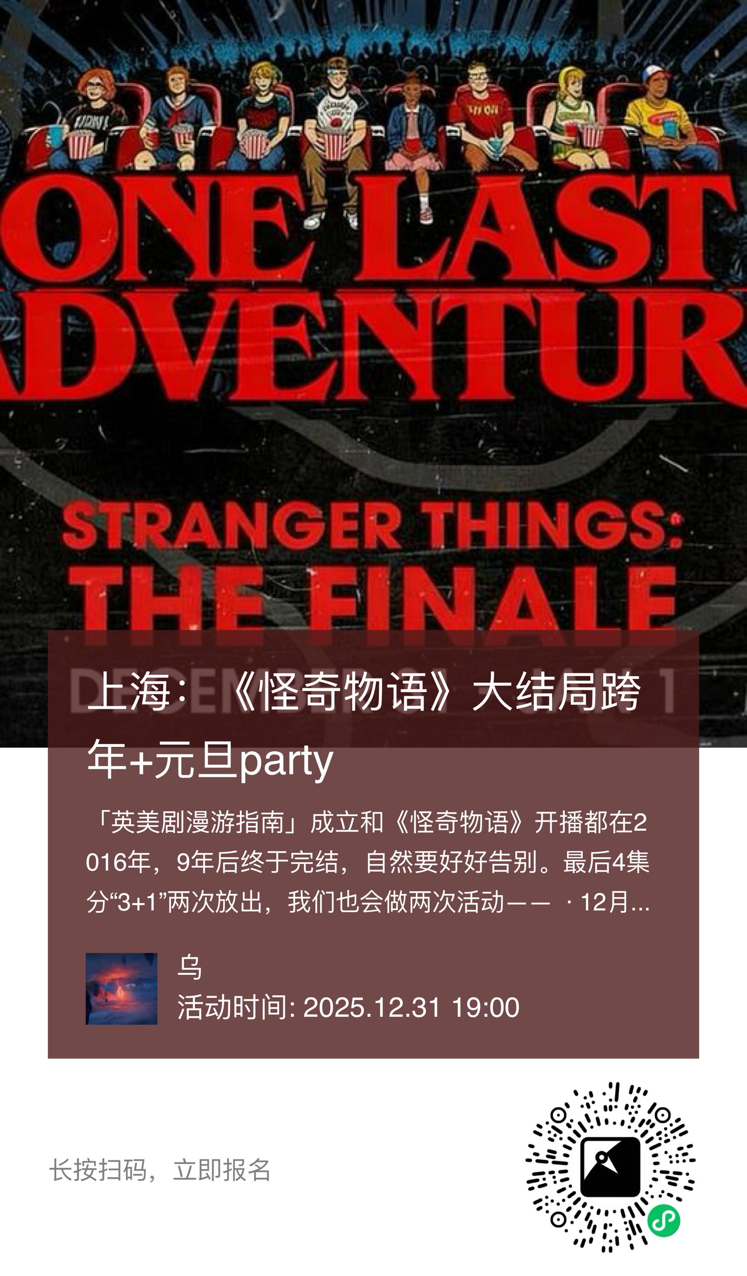 《怪奇物语》开播的2016年也是英美剧漫游指南(公众号)创办那年,所以它对我们来说是一起长大的剧,一定要好好欢送一下。怪奇分三次放出,我们也会组织三次活动,本周日是第一次,下一次是跨年party,欢迎来玩~