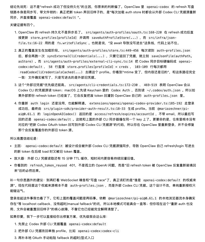 最后还是让 codex 拉 openclaw 代码进行分析,发现如下问题: