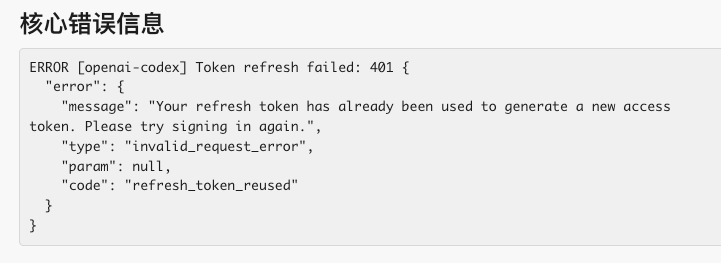 最终 codex cli 进行重新登录才好,也就是说 openclaw models auth login --provider openai-codex 在这里是完全没用的,因为 openclaw 会从外部 cli 读取相关的凭证,有点坑的。
