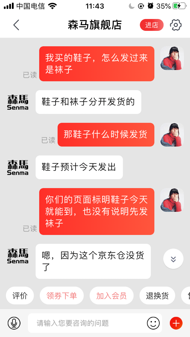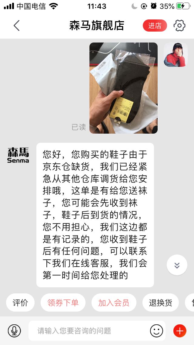 昨天在JD购买了一双马丁靴,却只发了袜子过来,果断投诉