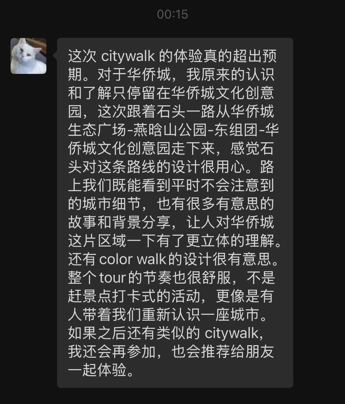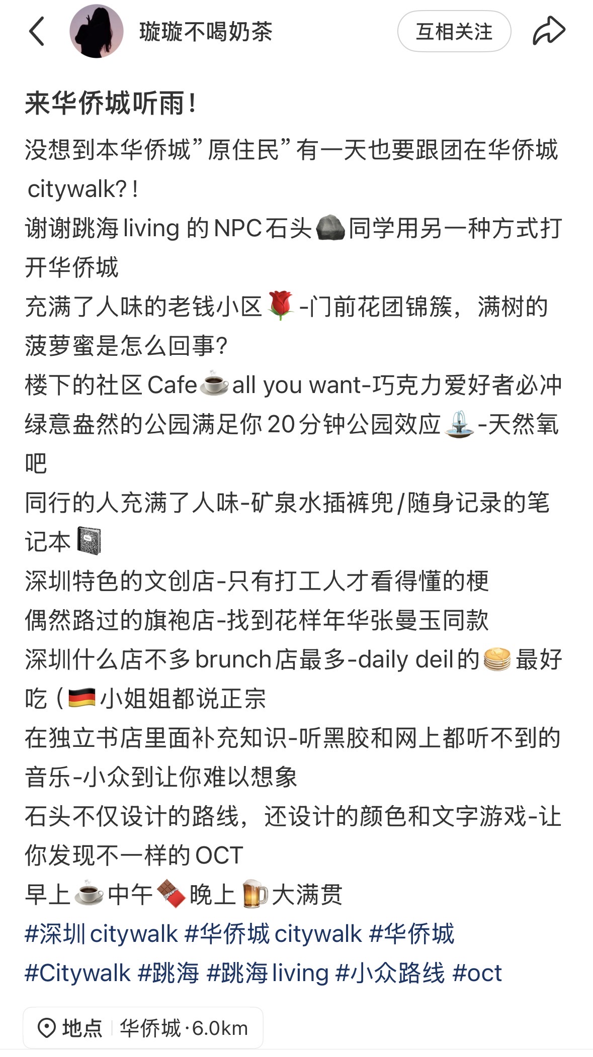 本次华侨城citywalk带队人依然是跳海Living的NPC(长住客)石头。谈及为什么要选择华侨城,石头说: