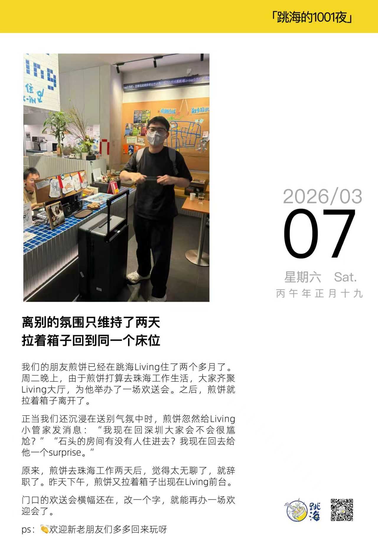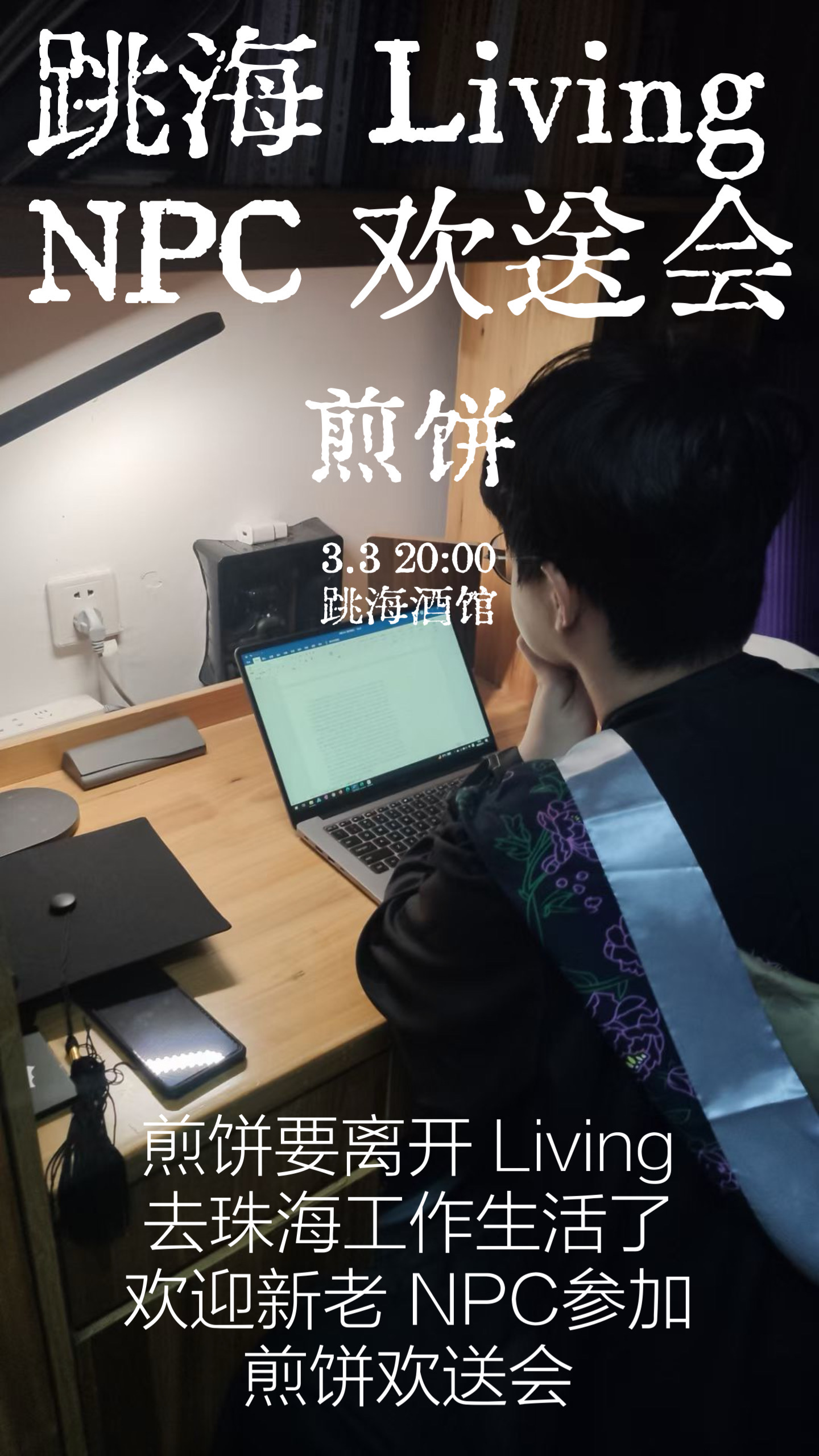 在Living住了两个多月的煎饼(心理学专业,酒馆下钟照“新晋水印”哈哈),过两天要离开深圳去珠海工作生活了,明天晚上我们要给他办一场欢送会,欢迎大家来玩呀~