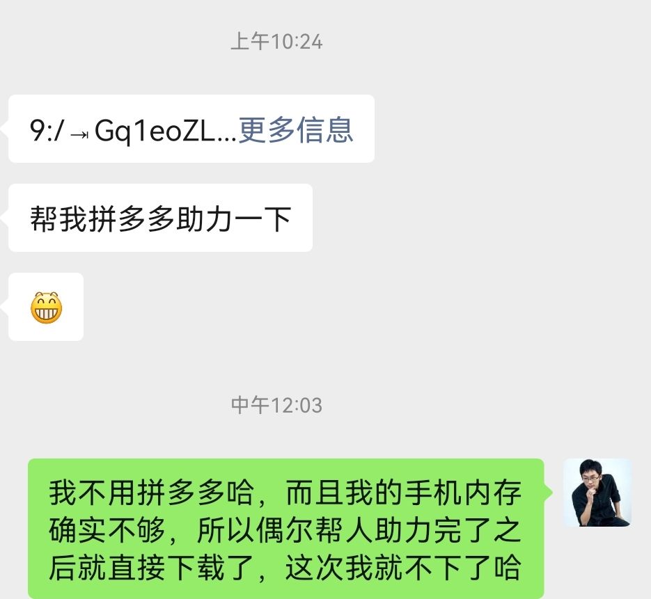 以前我特别不能理解,你把你跟陌生人之间仅存的那点信任消耗在拼多多助力上,现在我能理解了,但我个人不会选择这种做法。