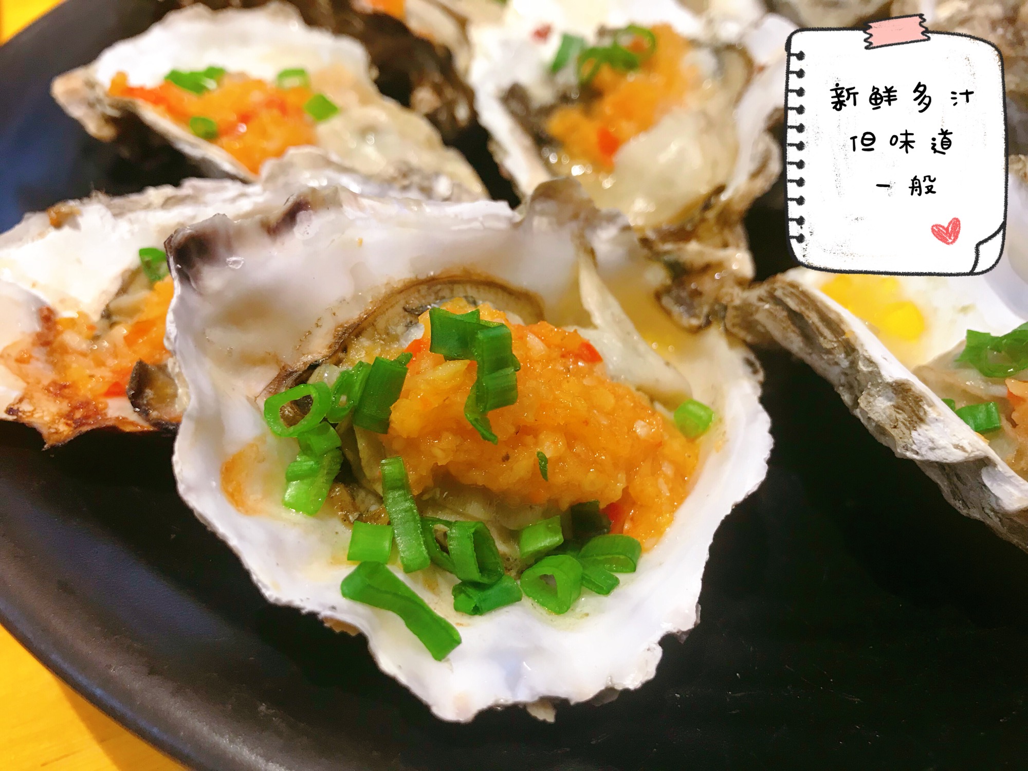 朋友圈被这家刷屏,抱着很高的期待去了🐷然后,失望🌚烧烤店,全是烧烤,主打生蚝👅客观来讲,生蚝品质还是不错的,新鲜多汁~喜欢生蚝的胖友应该吃得很开心❤️而且现在活动价,48元买一打送一打,还是很划算的😆(不过到店也能享受的优惠,在网上的券白抢了🤷🏻♀️再次中了商家的套路🐷)