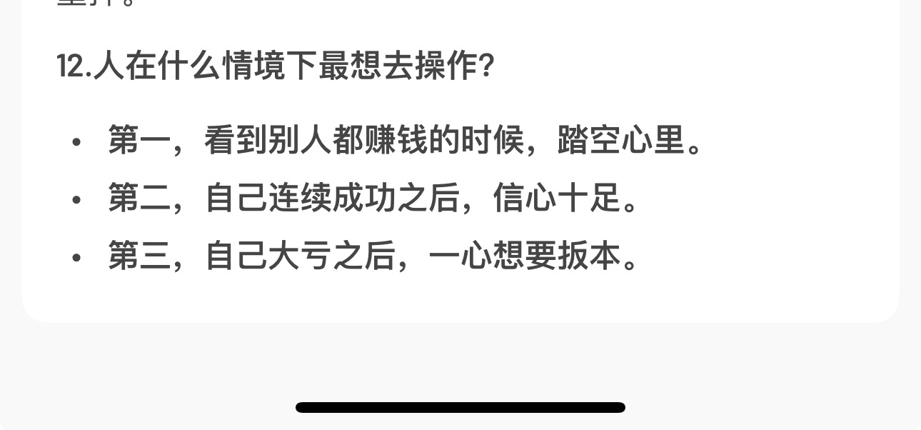 神仙大鱼: 顶级高手,不可怜任何人,不信任任何人,不深交任何人,不跟任何人诉苦,能藏拙,能沉住气,不炫耀,不高傲,心思缜密,小事糊涂,大事杀伐果断,对事看破不说破,内心祥和平静,独来独往,不需要前呼后拥,奋勇攀附,这就是顶级高手。