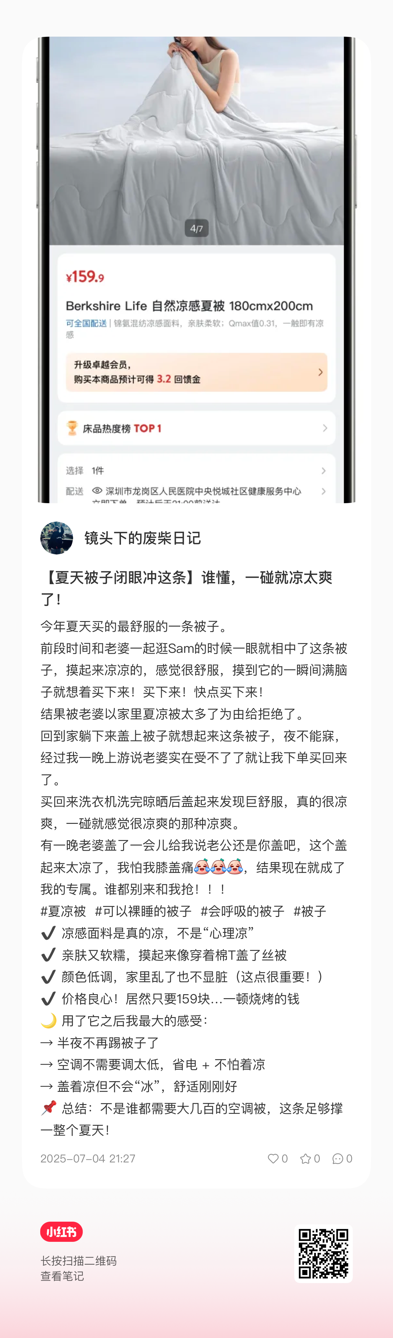 这个被子好舒服,盖起来凉凉的,是今年夏天买过最值得的东西了。