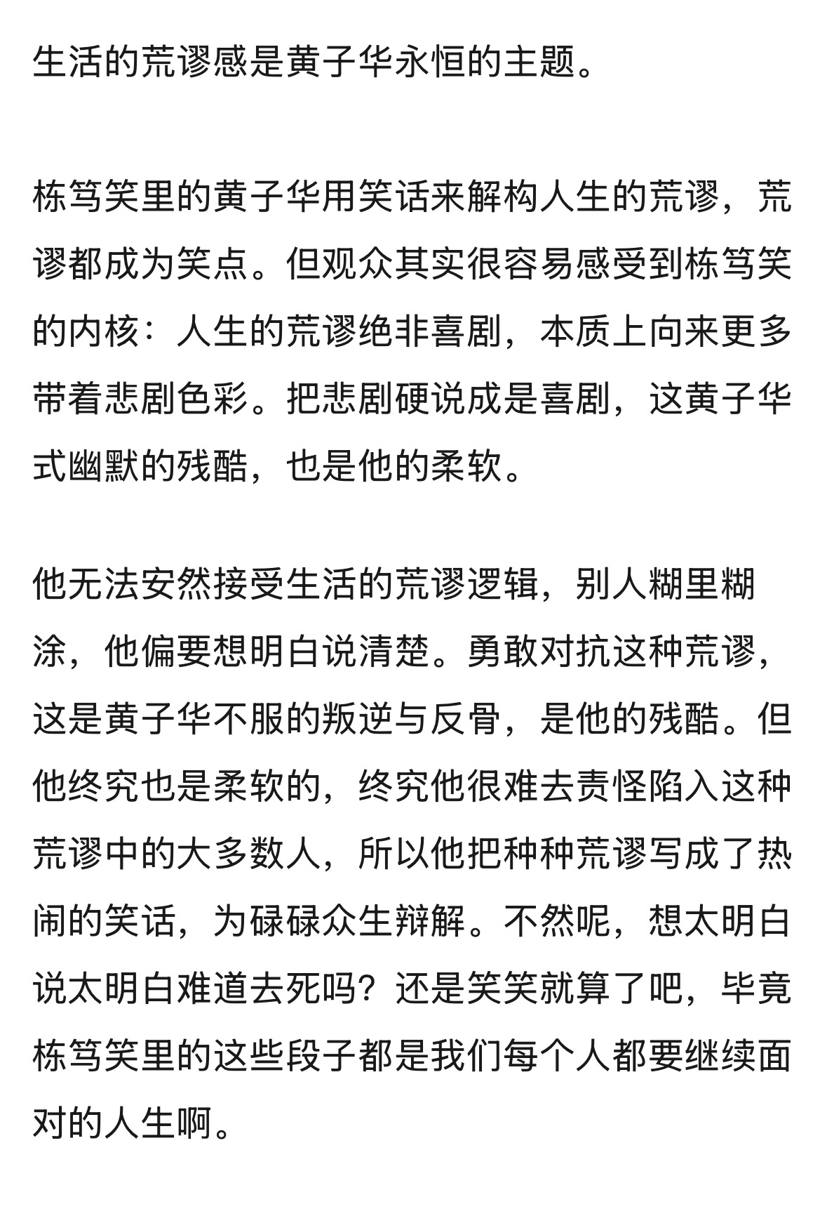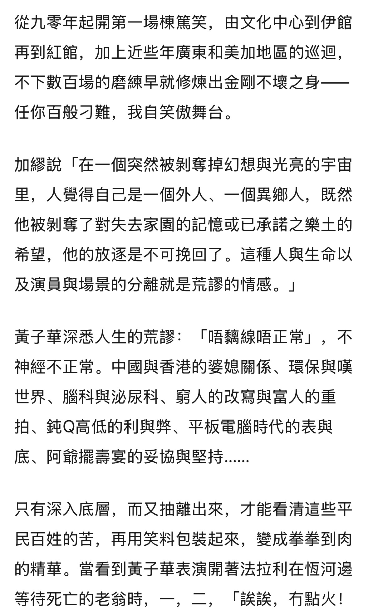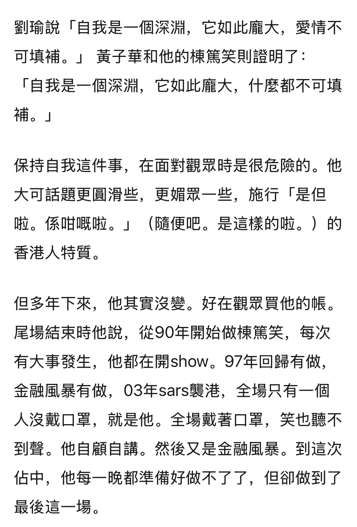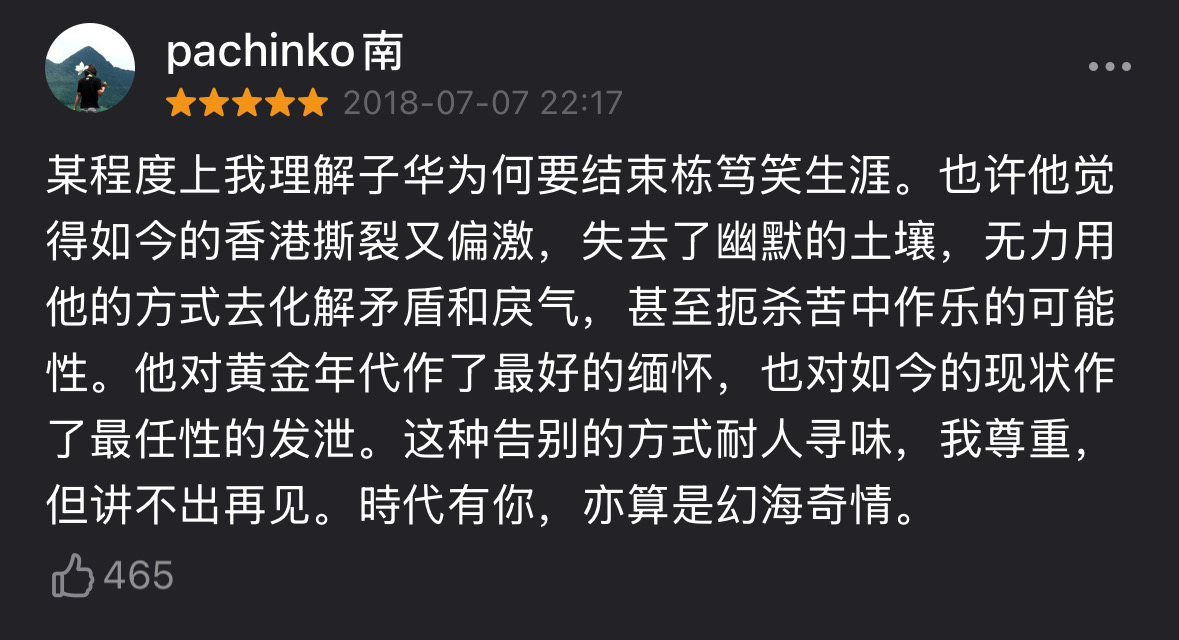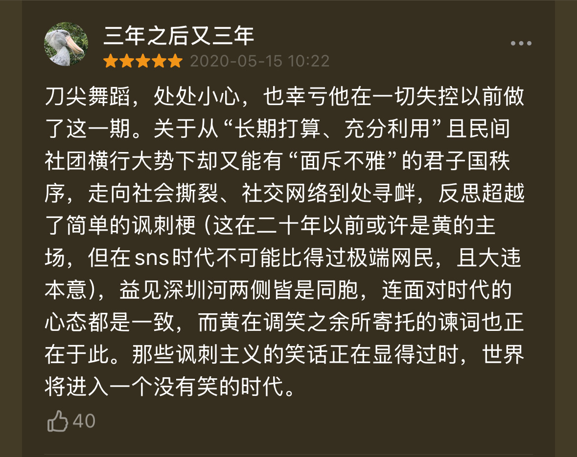 黄子华 —— 90年代的荒谬大师,从小人物角度出发,用幽默的口吻讲述了时代洪流中被冲垮的这几代人,是喜剧的形式,是悲剧的内核,是哲学的思考。