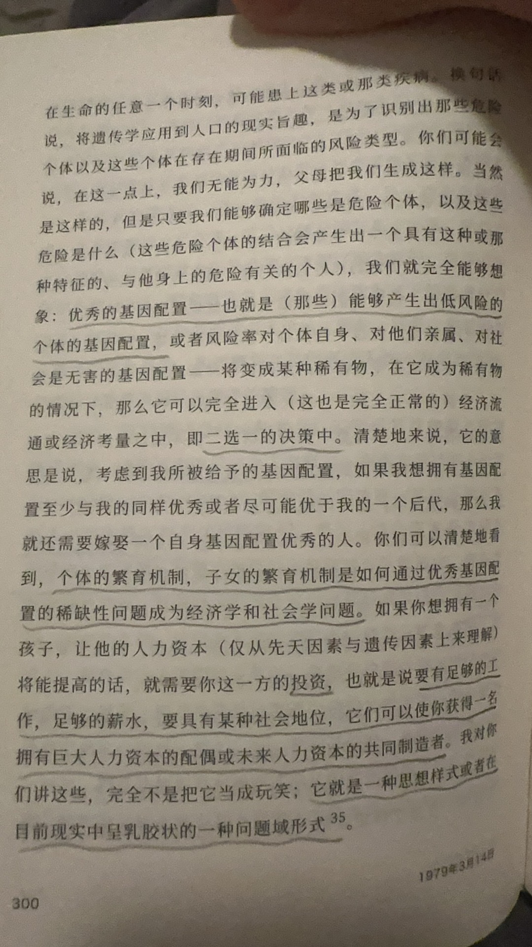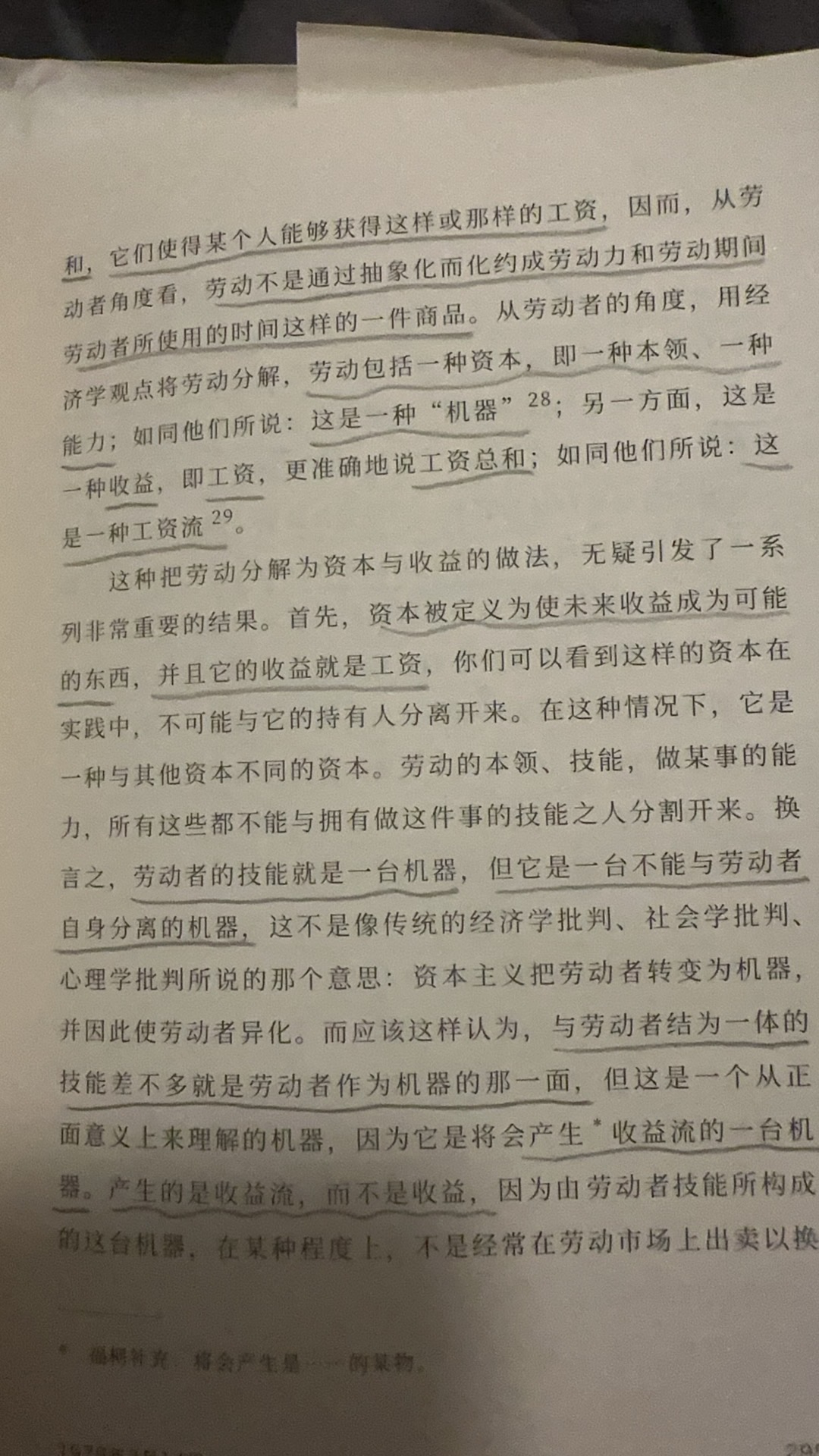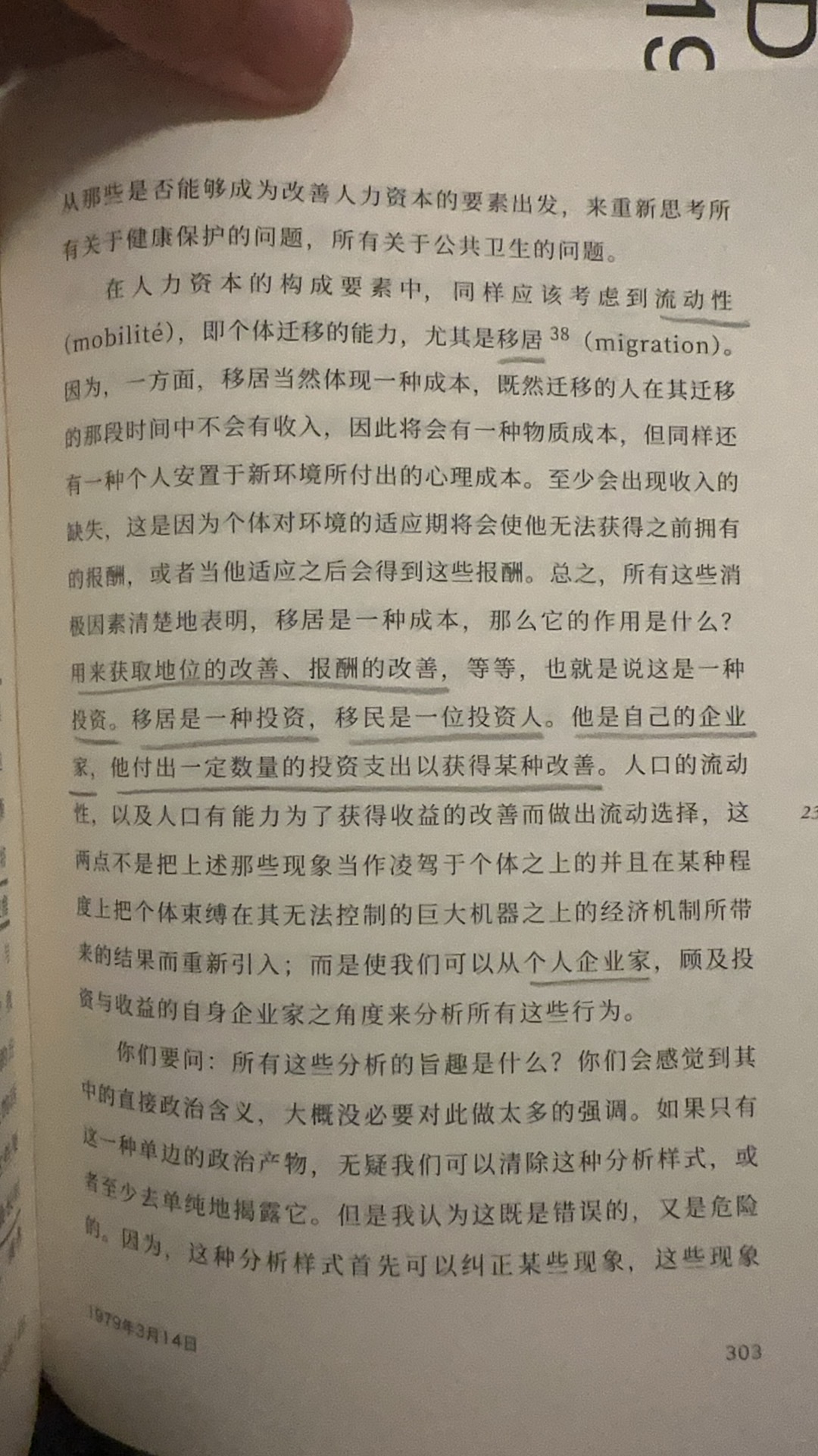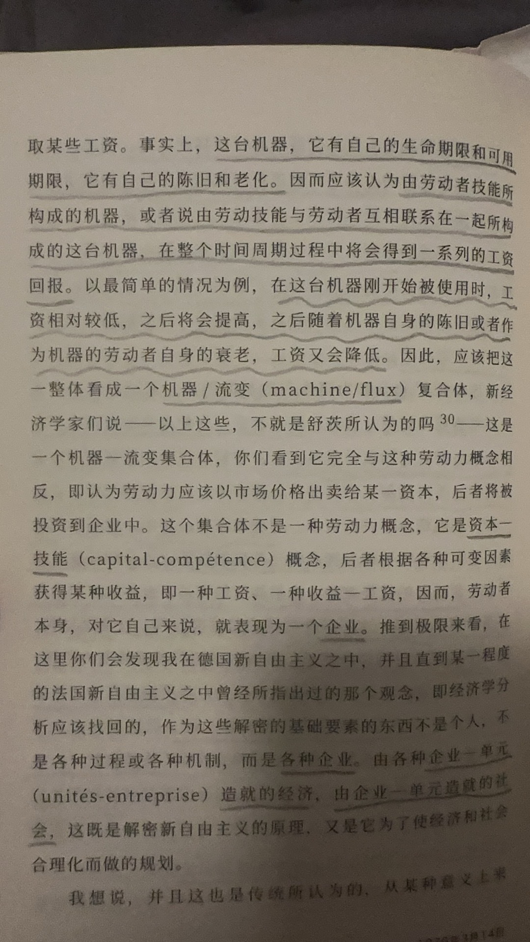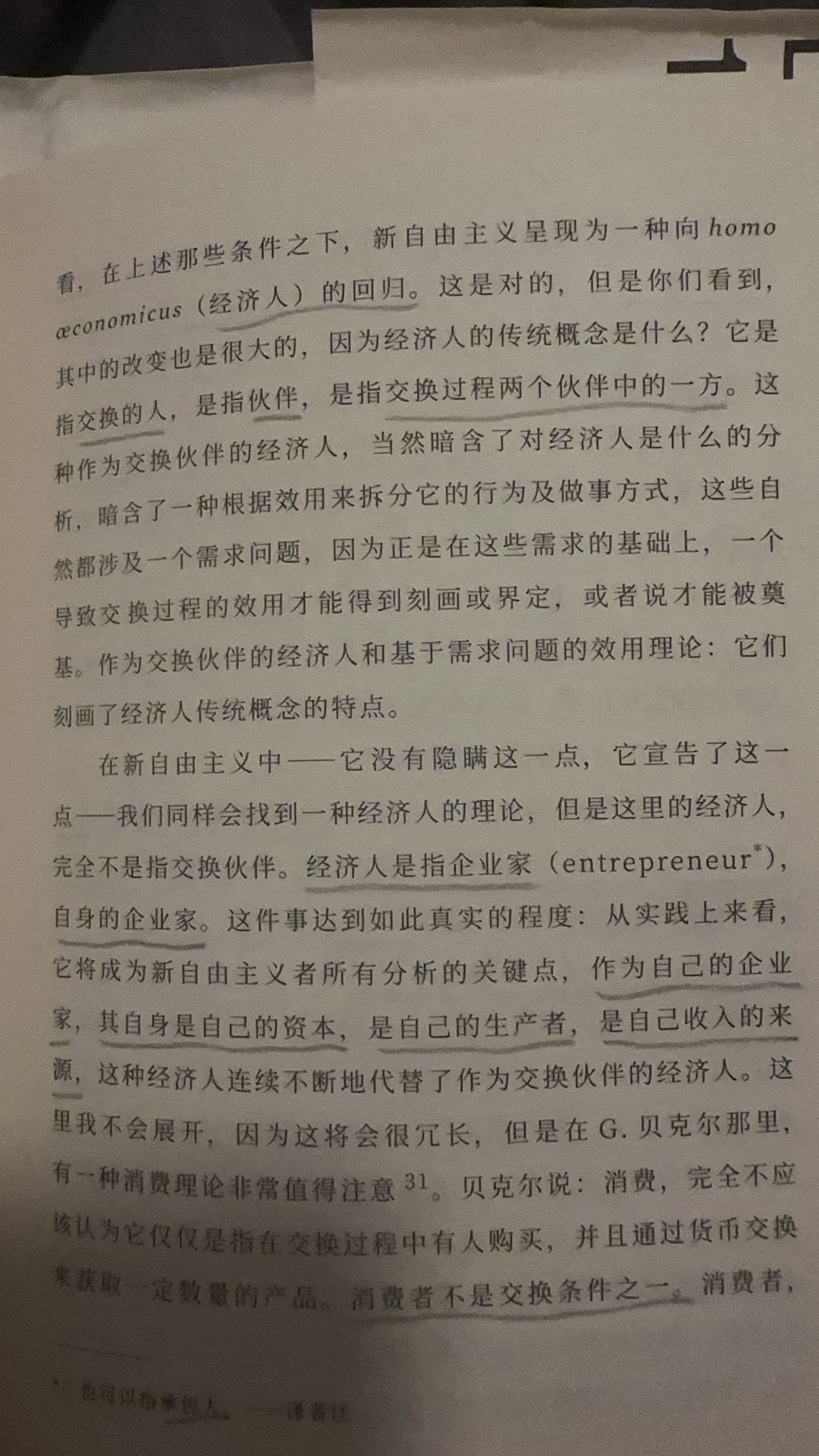 经济人的回归不是作为交换的人的回归,而是作为企业家的回归,是自身既作为生产者又作为消费者的经济人,消费也是一种生产,它生产自身的满足,他的工作能力是一种与他不可分离的机器,它无时无刻生产并消费着,工资是人力资本的报酬或收益,它也是技能-机器的收益,人力资本便需要对其进行投资,有先天的投资:对基因的投资,使自己获得能够拥有优秀基因的伴侣的能力以及未来人力资本的共同制造者。后天的投资:对自身的投资,对子女的投资,教育的投资,在子女身上付出的时间和获得的报酬产生的收益比,移居也是一种投资,它是对自身未来的投资,他投资目的地的国家,这所有的投资都具有风险,但个人作为企业家,风险交由自身承担,于是保险也是一种投资,对自身风险的一种控制投资,于是你会发现所有的投资都是消费,而所有的消费都是生产,它生产着自身的满足,这便是新自由主义机器对人的改写,并不是把人机器化,而是人就是作为一台永不停歇的机器,自我生产,自我消费,自我满足。