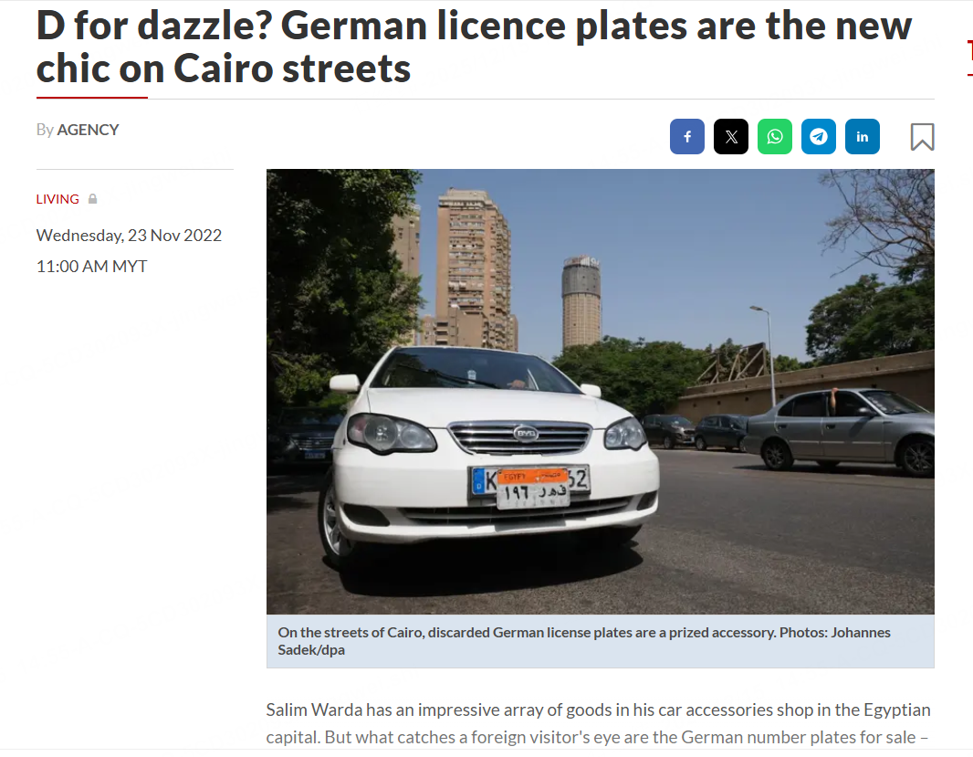 大家默认这类车牌对应的车,代表着西方的好品质、精细工艺,能显出车主所谓的社会地位,哪怕这车牌在埃及已经没有法律效力。