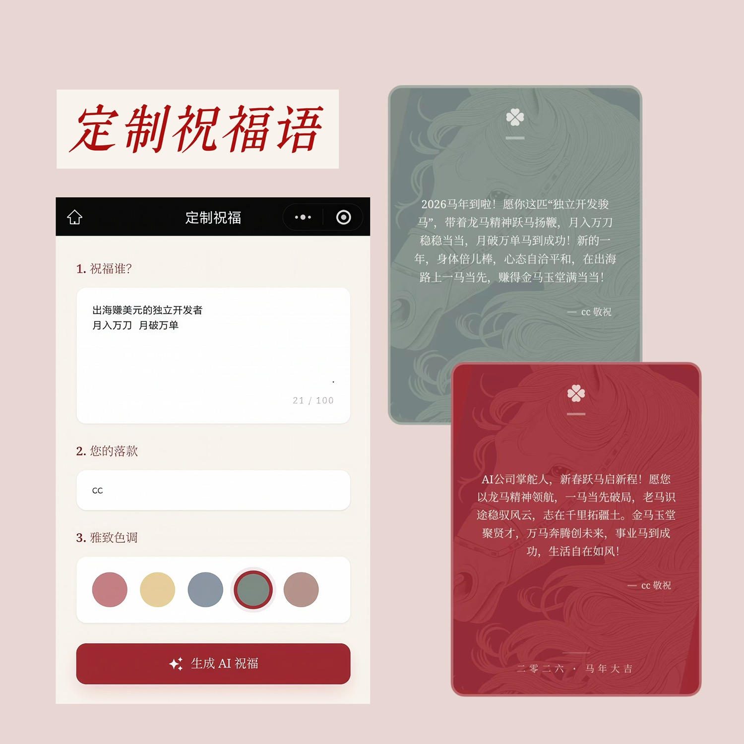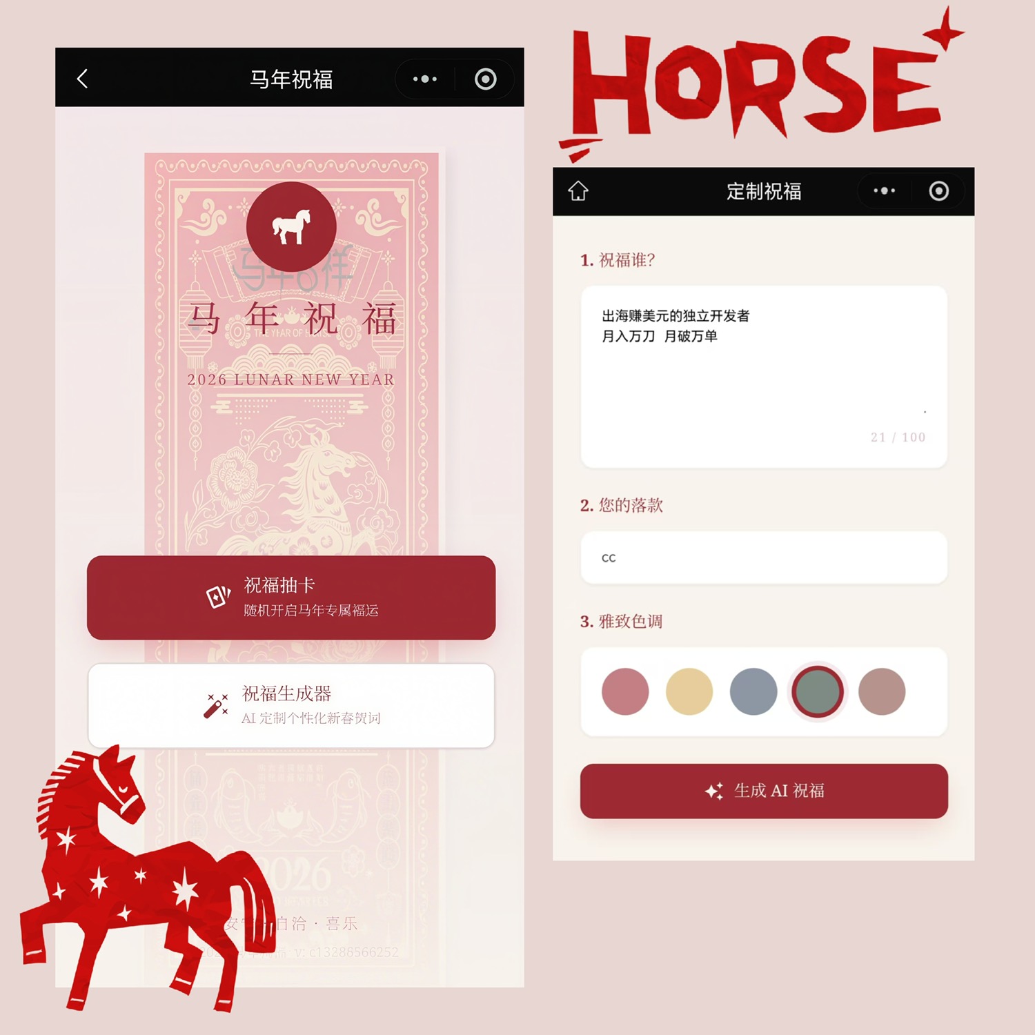 👉 「造祝福」:填入TA的名字和你的心意,就能生成带专属卡片的祝福语,可一键复制(图片保存和分享暂未发