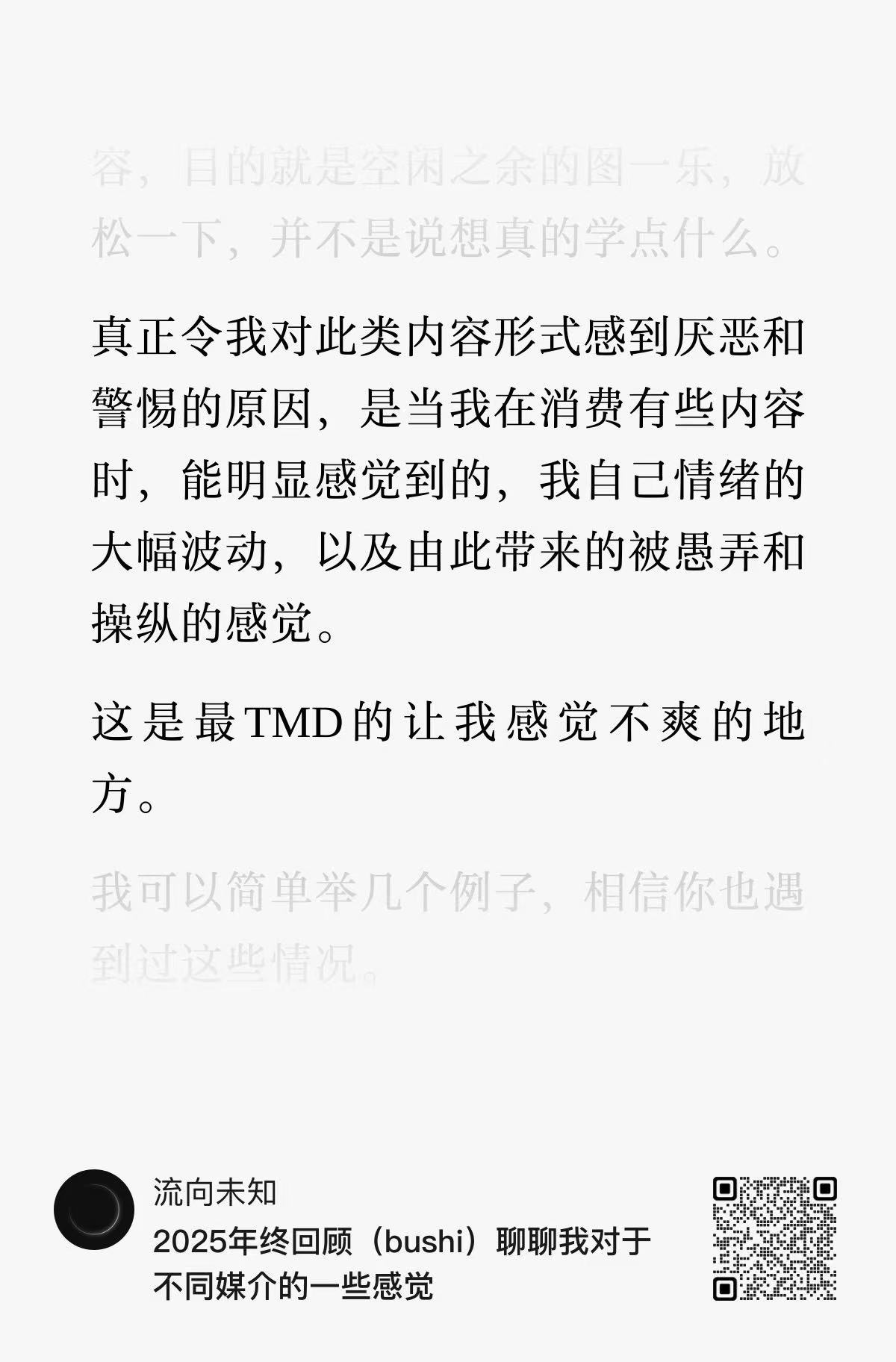 经火: 本来是想要写一个年终回顾,盘点一下自己2025年消费的各种内容,书、影视,播客之类的。 结果写着写着走偏了,变成了聊自己对于媒介形式的偏好🤣 不过又想着这反而是扣题了公众号的名字-“流向未知”了,哈哈。 所以索性就不修改了,前后不搭,但是原汁原味儿🐶