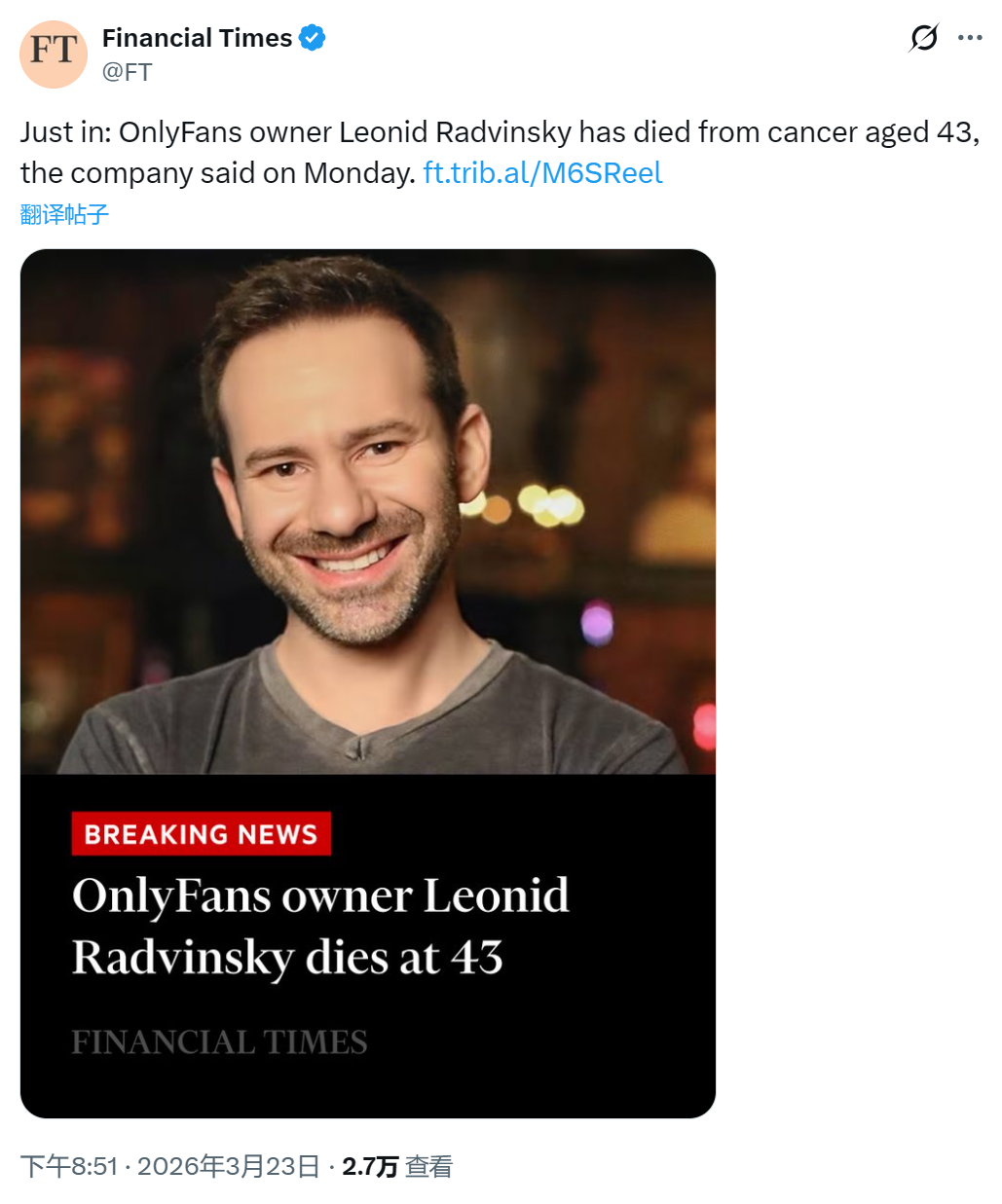 Onlyfans 老板英年早逝