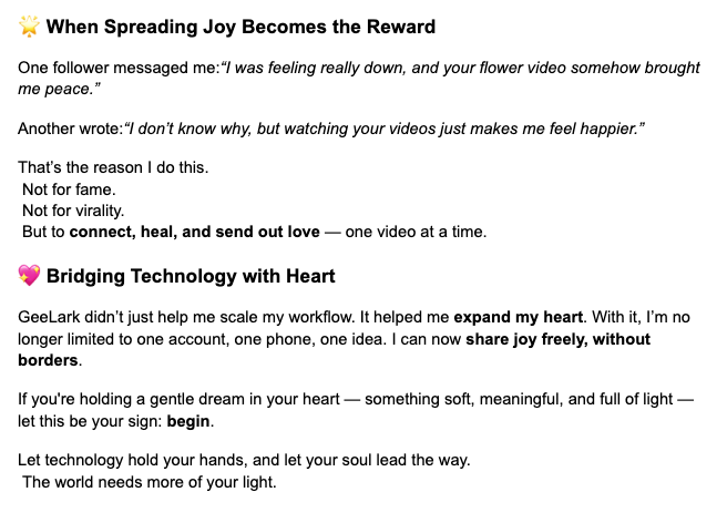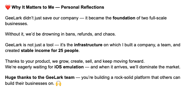 图 1/2/3 是我们最近收到的几条用户反馈,非常的感动,回应了我们做 GeeLark 这个产品的初心(站在无数普通人和团队旁边、一起成长)