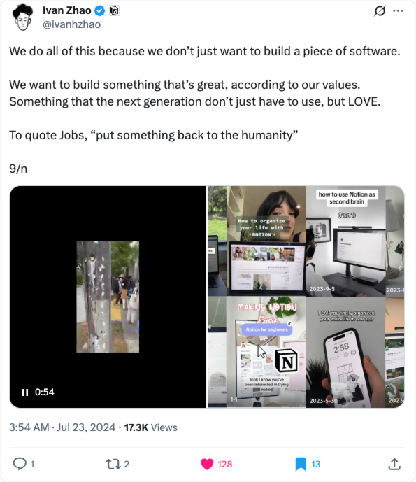 图 5 是 Ivan 前段时间在日本一个互联网大会上演讲的一页 keynote,讲 Notion 的使命,大意是“在人生事业中,拥有美丽的工具”