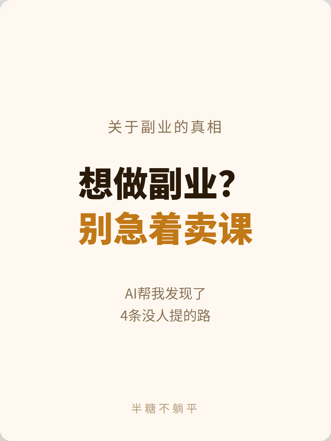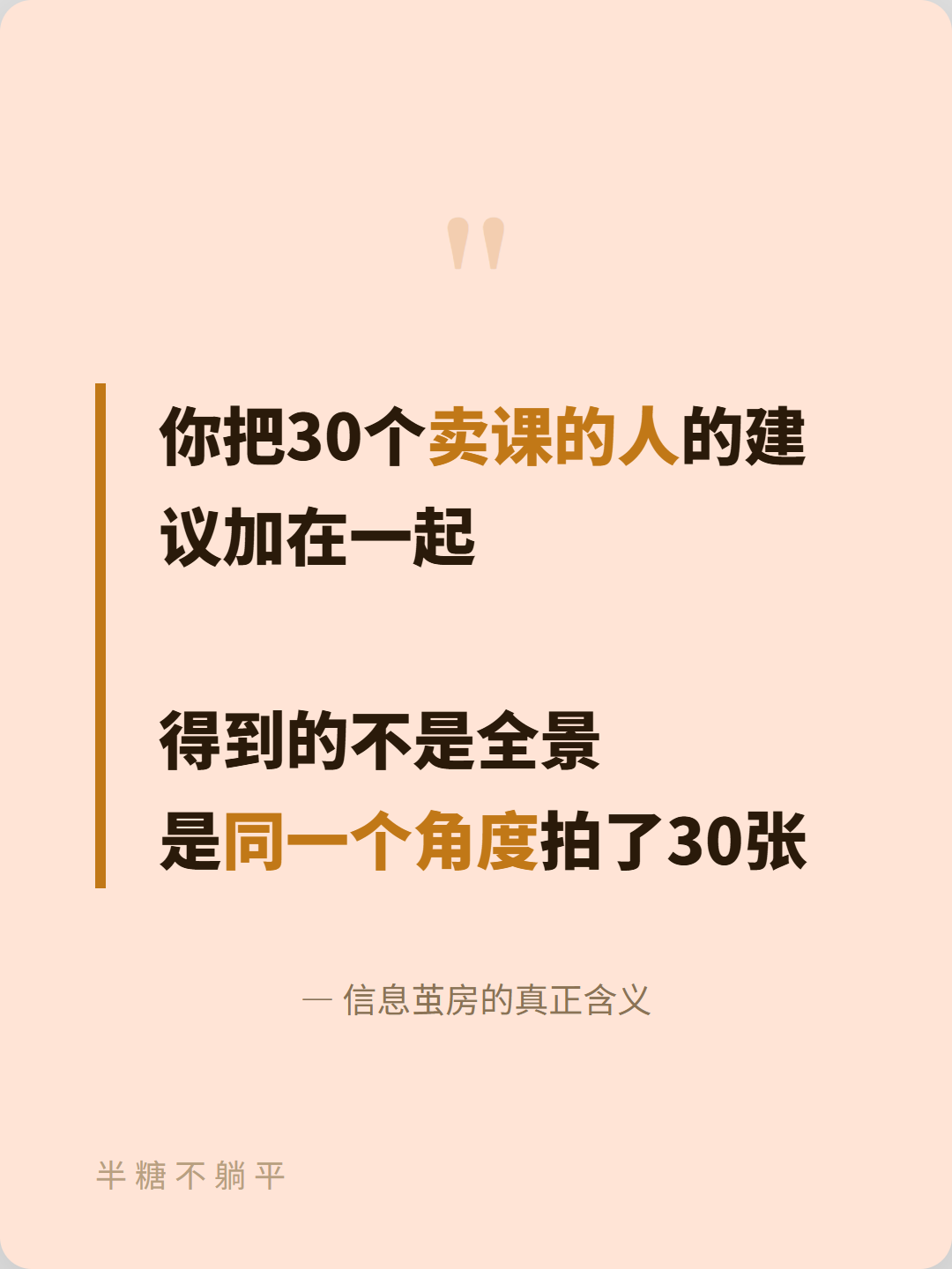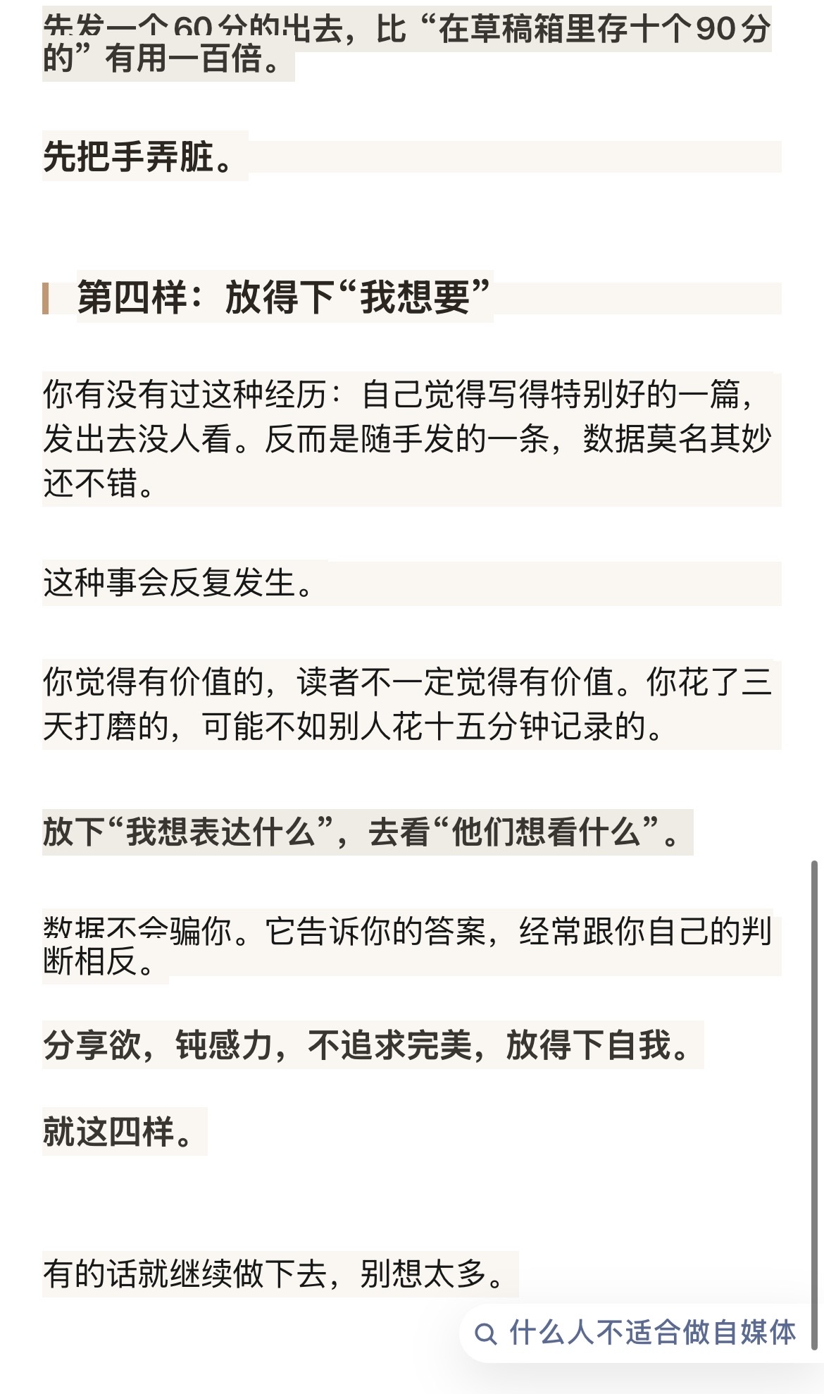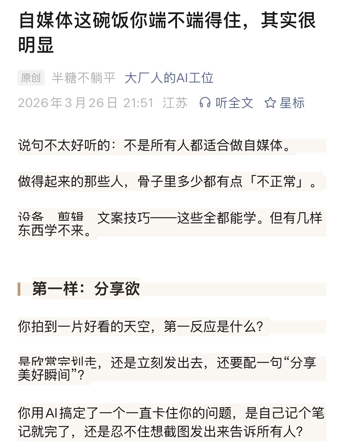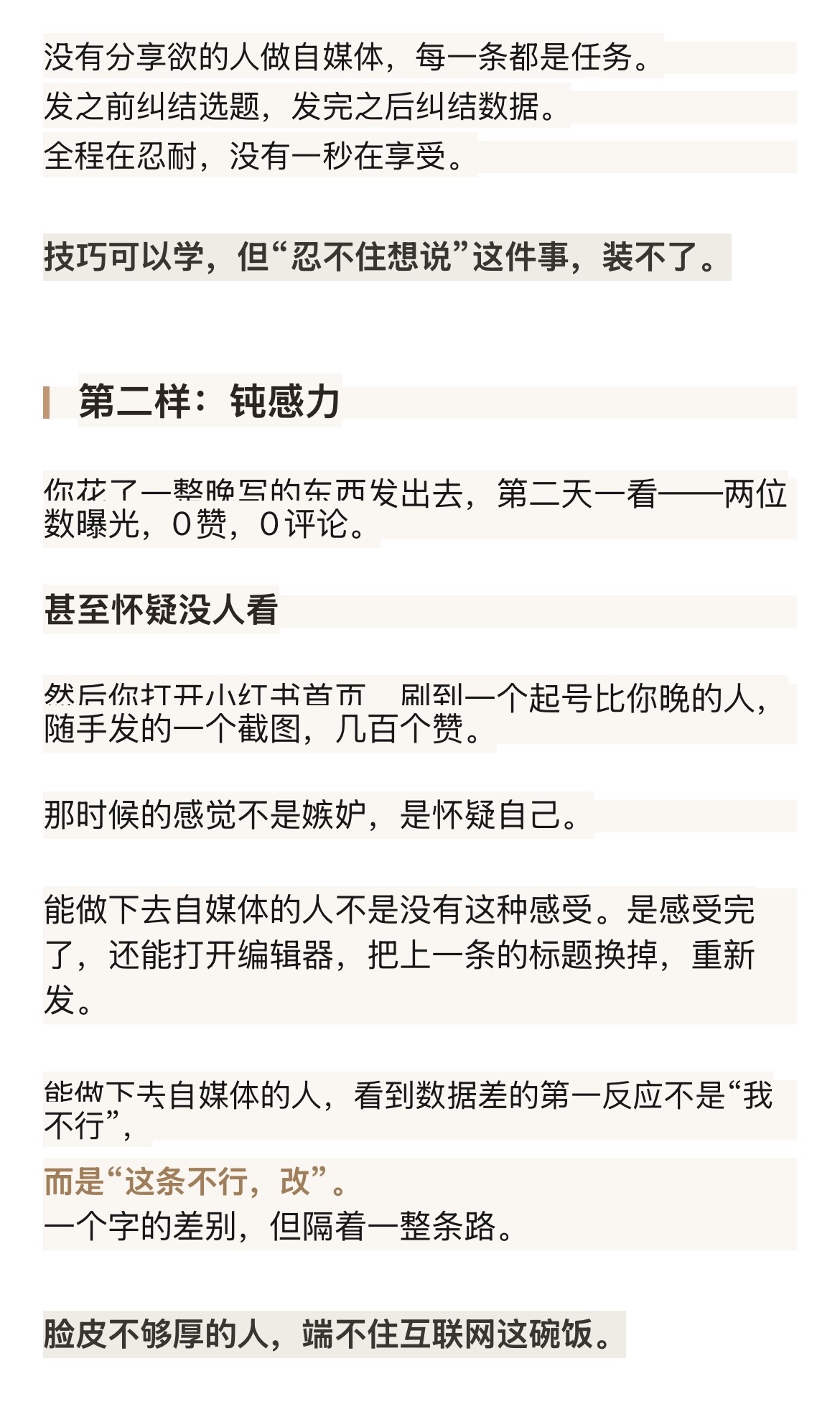 有分享欲的人做自媒体,选题不是问题。因为他们的日常就是在「忍不住想说」。没有分享欲的人做自媒体,每一条都是任务。发之前纠结选题,发完之后纠结数据。全程在忍耐,没有一秒在享受。技巧可以学,但“忍不住想说”这件事,装不了。