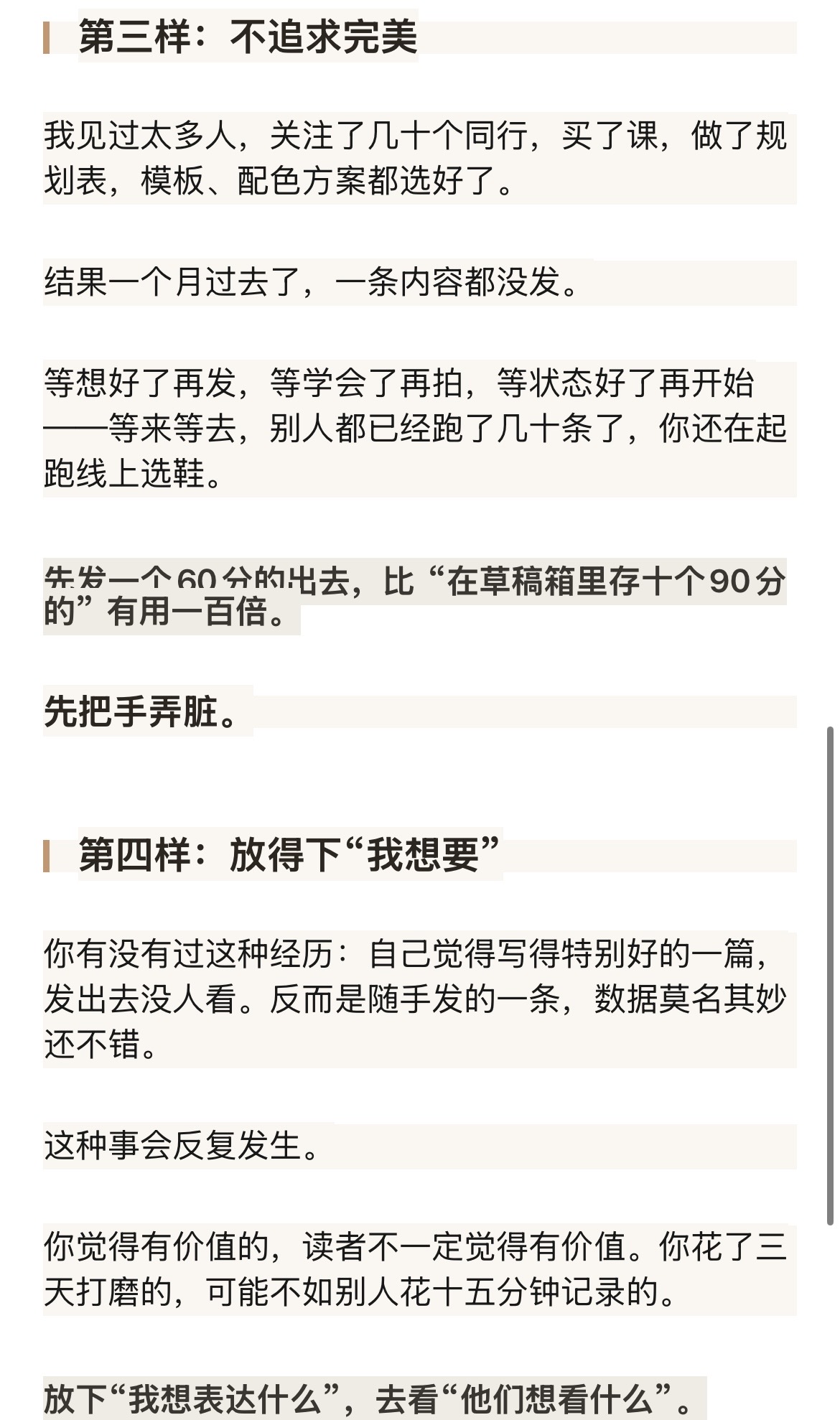 结果一个月过去了,一条内容都没发。等想好了再发,等学会了再拍,等状态好了再开始——等来等去,别人都已经跑了几十条了,你还在起跑线上选鞋。先发一个60分的出去,比 “在草稿箱里存十个90分的” 有用一百倍。