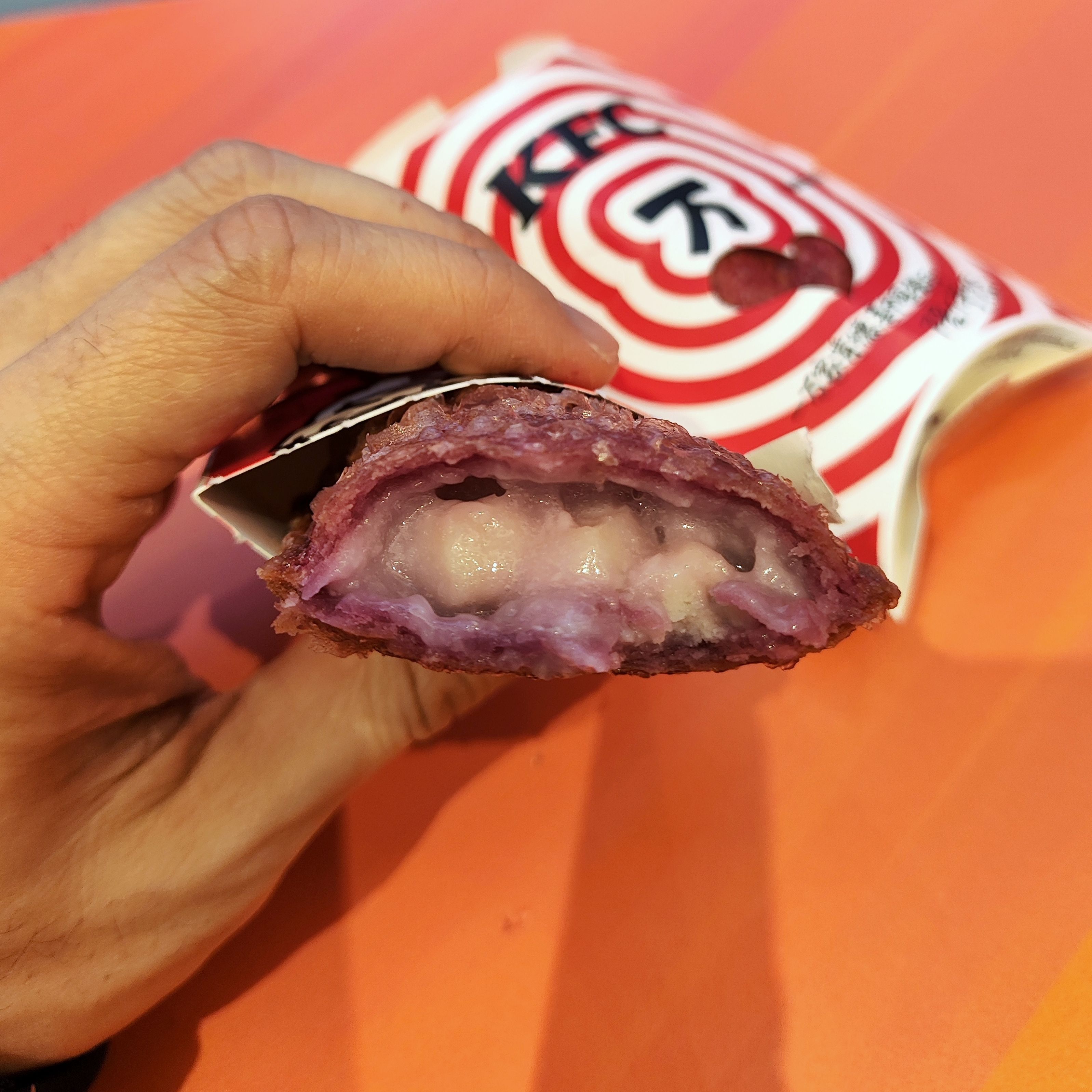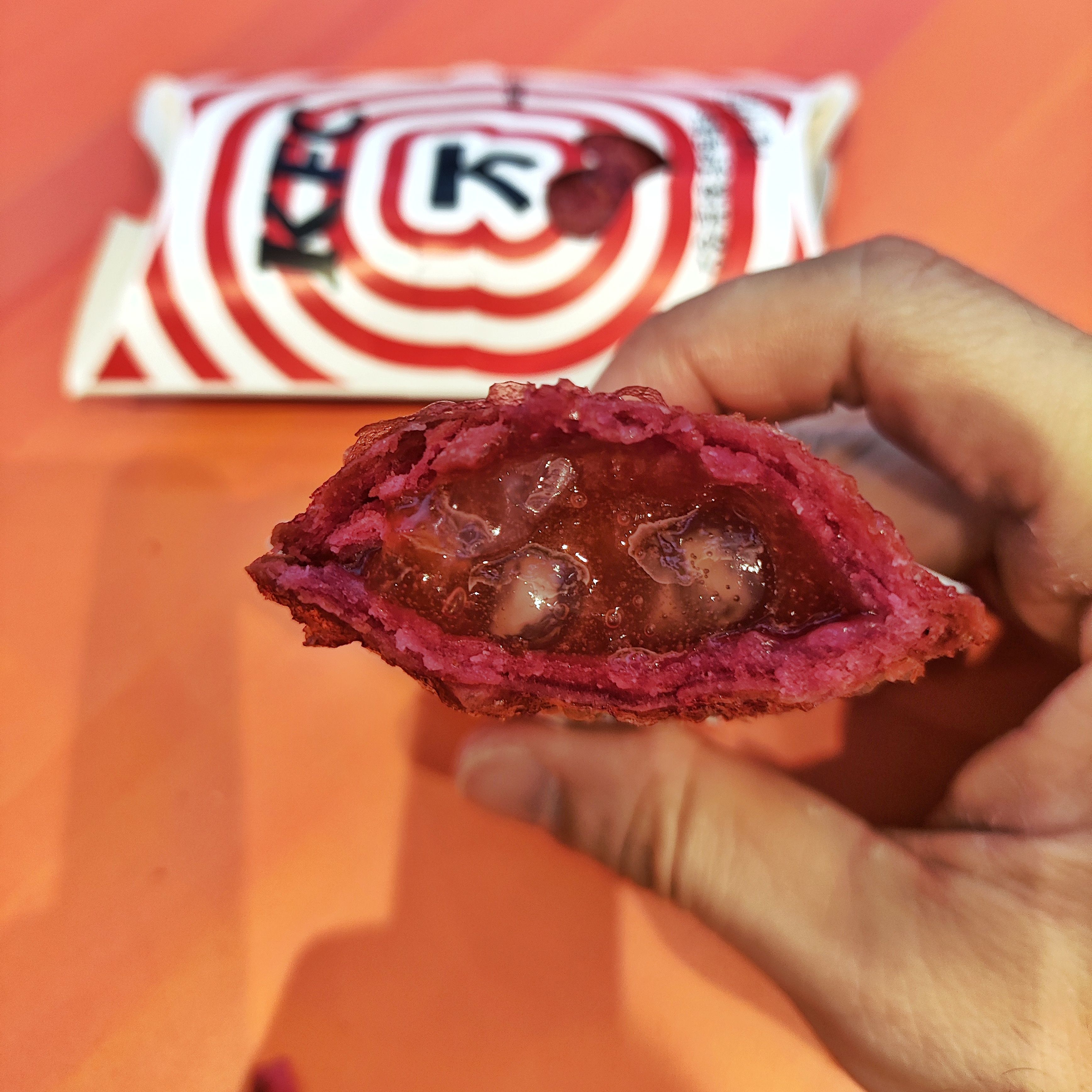 试了KFC的派!KFC的派比麦的小一大圈。因为喜欢吃爆珠,拿了两个石榴爆珠!好甜!不推荐!太甜了!