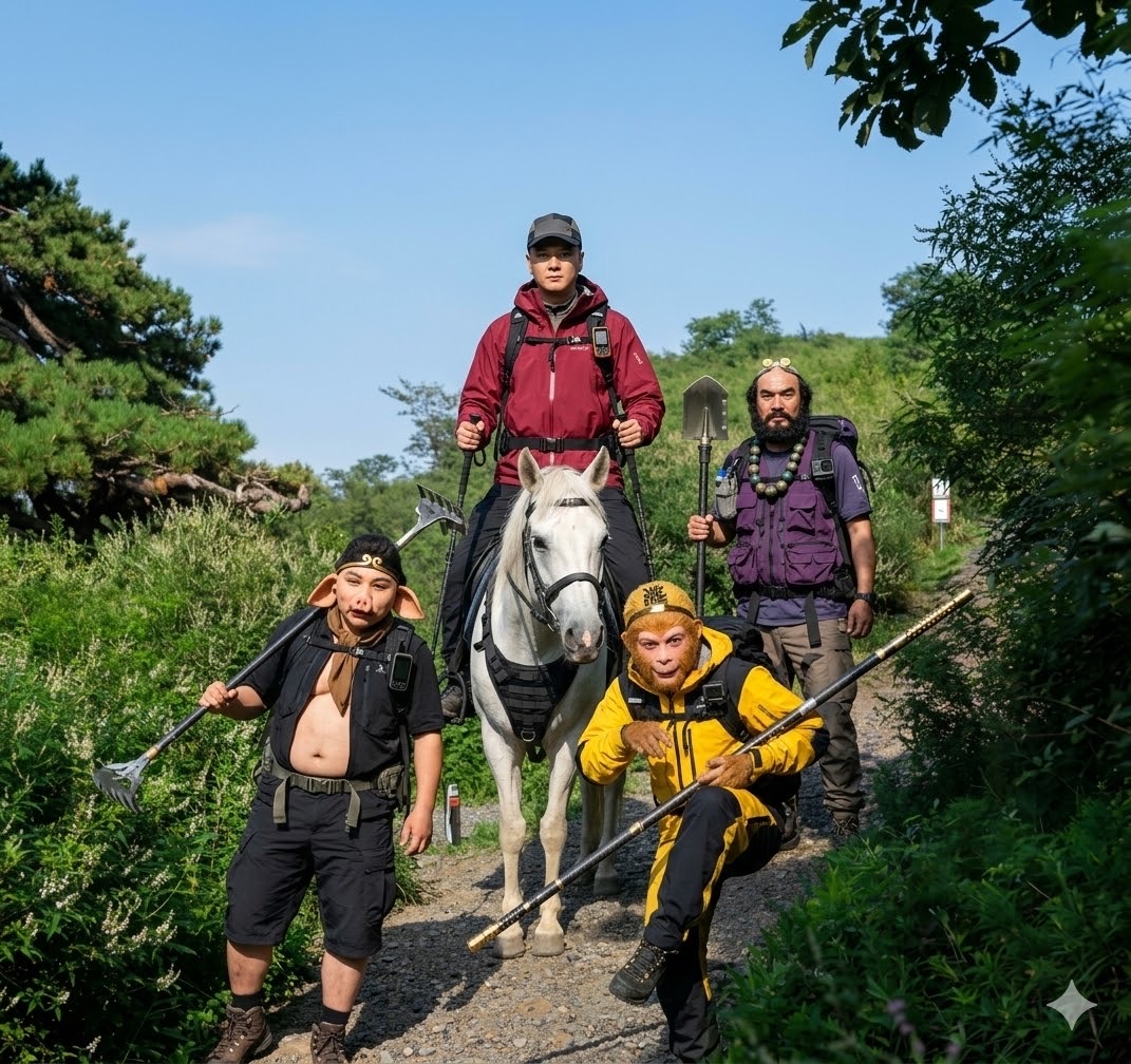 用nano banana帮师徒四人穿上专业徒步装备
